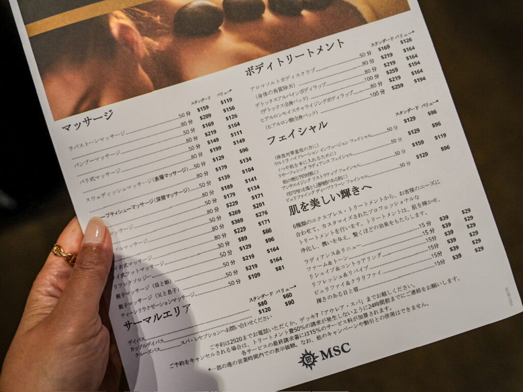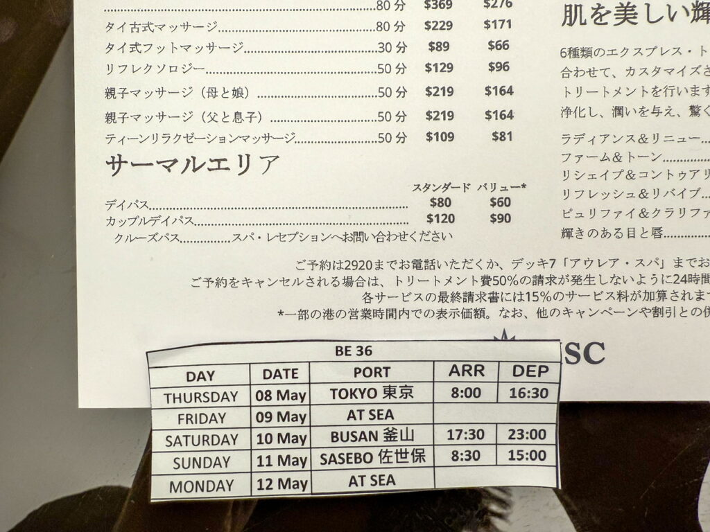 スパメニューはご覧の通り。今回サーマルエリアは乗船2日目に契約をしました。