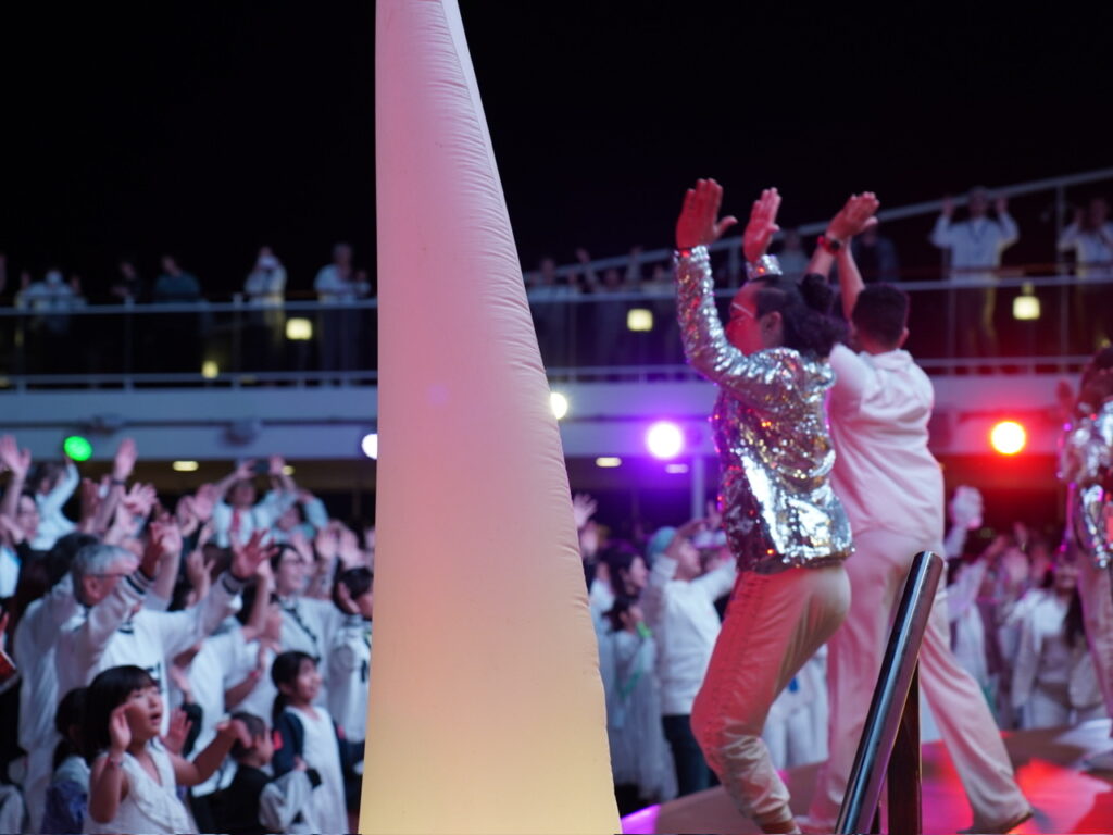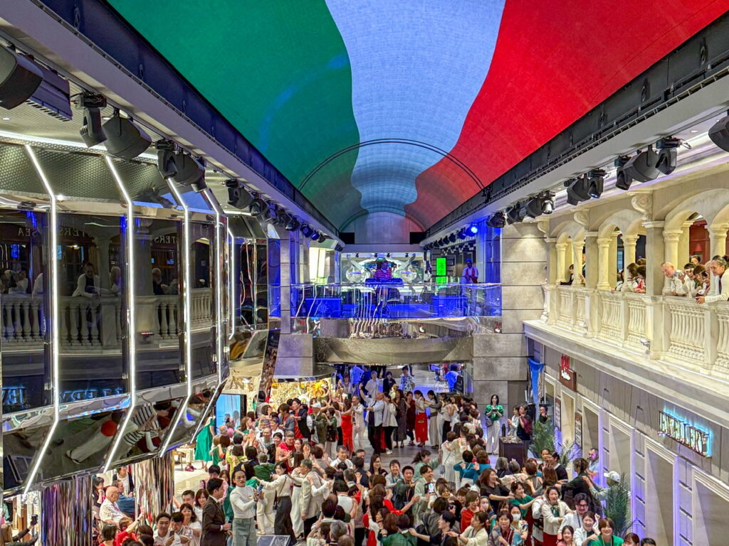 プロムナードの洋上最長96メートルの壮大なLEDドームもこの日はイタリアンからで彩られ、会場の全員でゲームに参加していました。