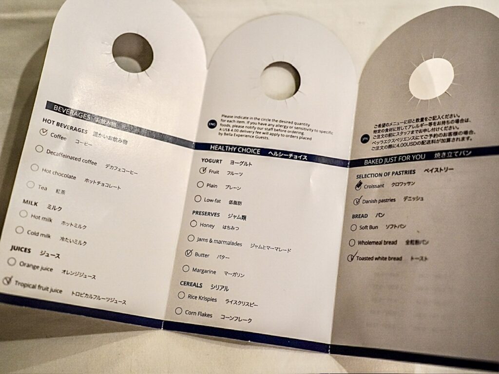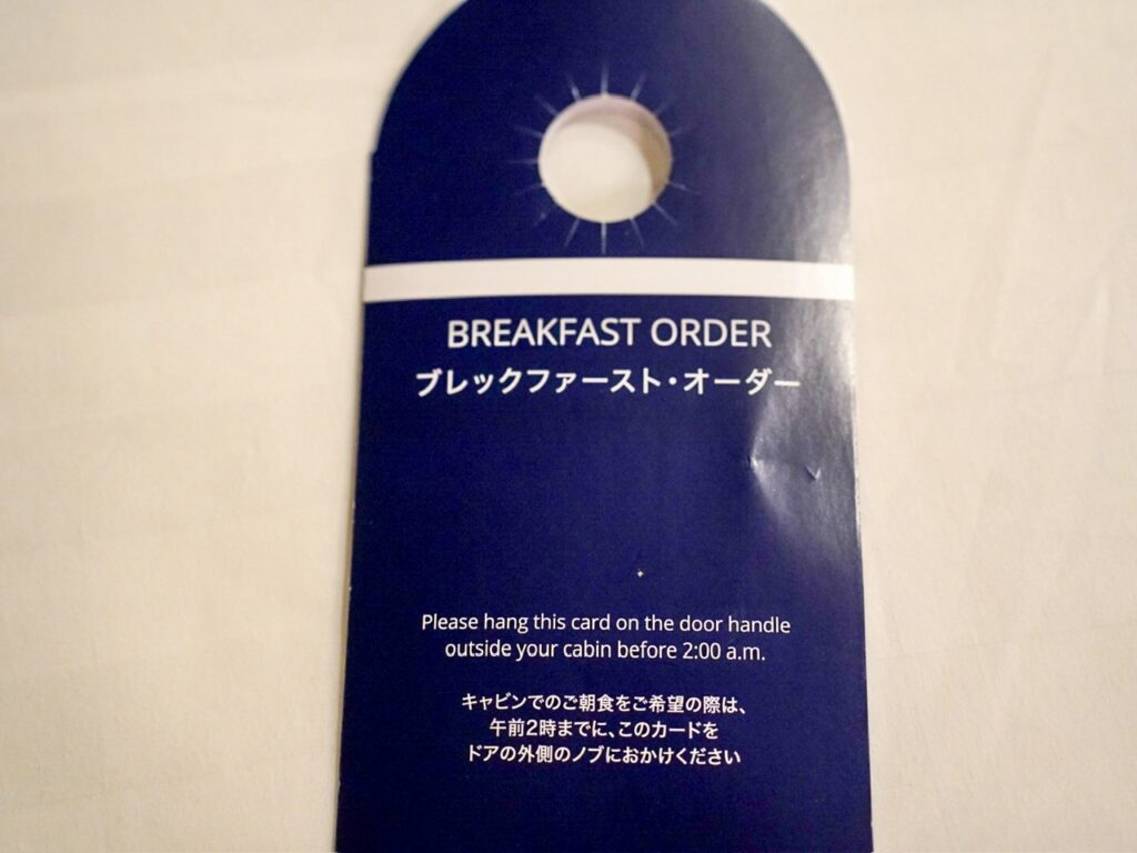 午前2時までに希望の朝食にチェックをいれ、ドアドブの外側にかけておきましょう。