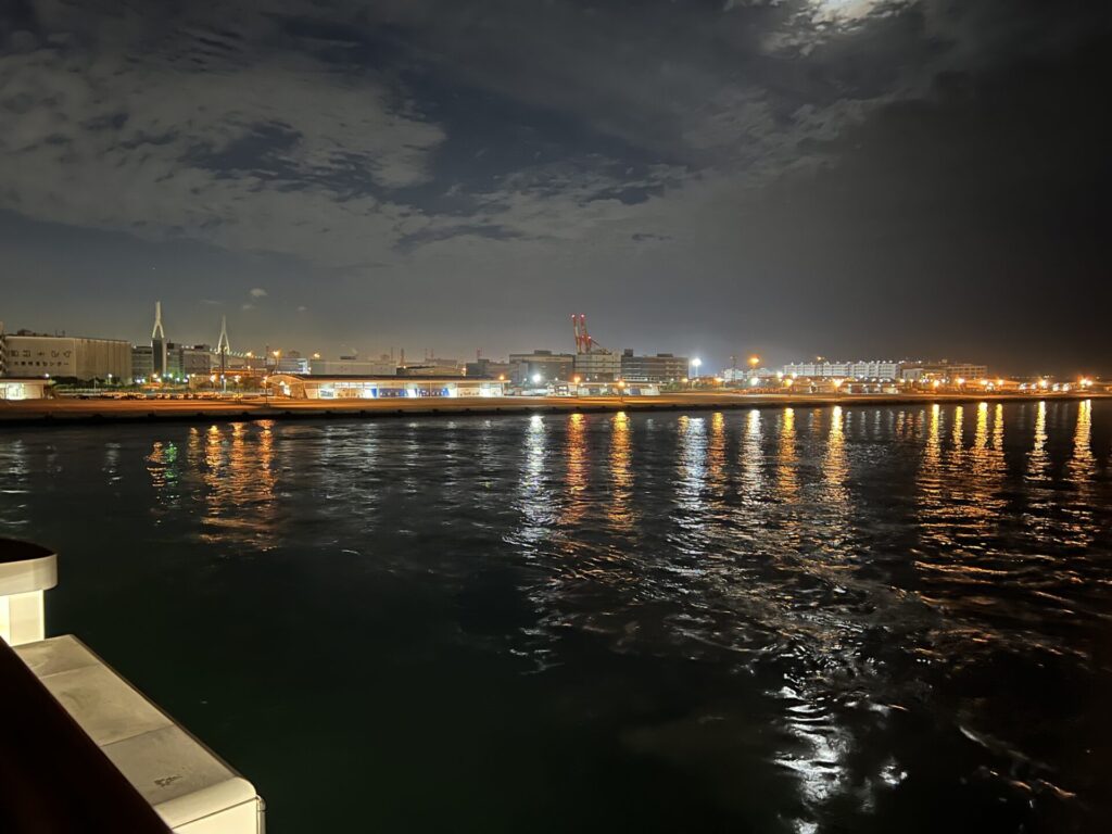 ベイブリッジ近く、「横浜港 大黒ふ頭客船ターミナル」から船は出港します。