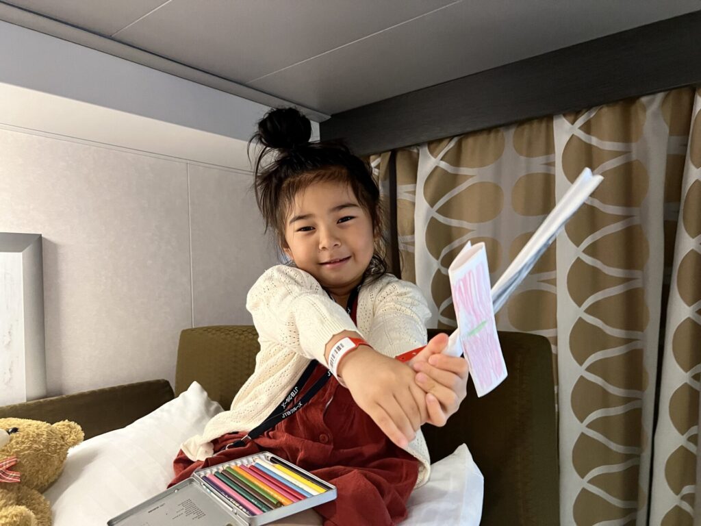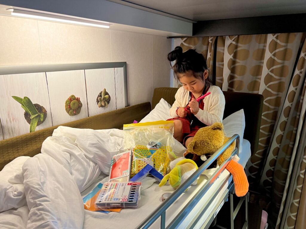 娘と船内を探検したり、旅先でも家でやっていることと変わらず、得意の工作を楽しんだり。