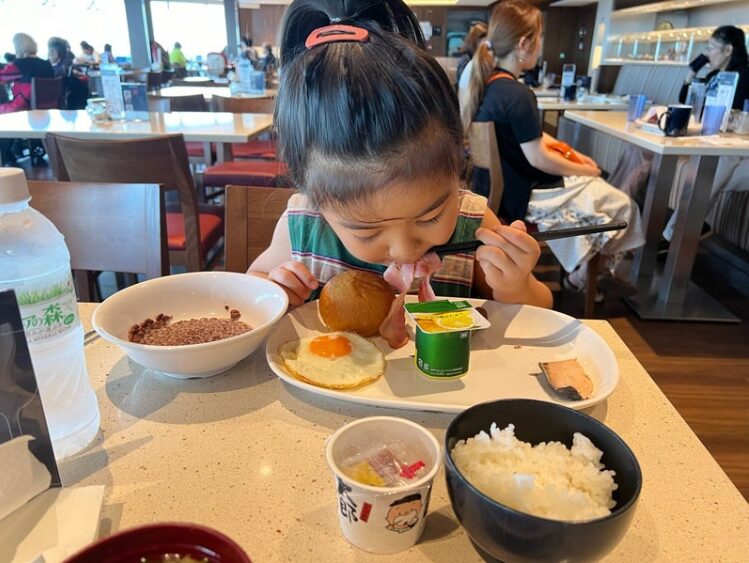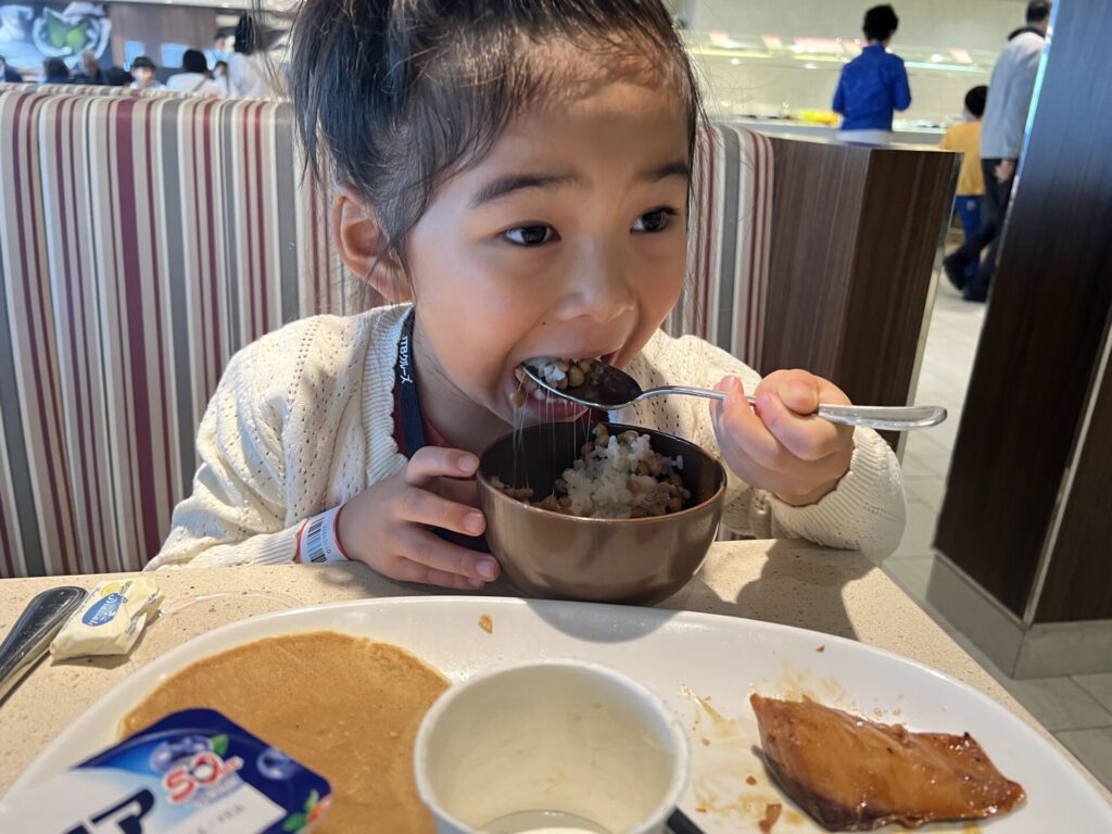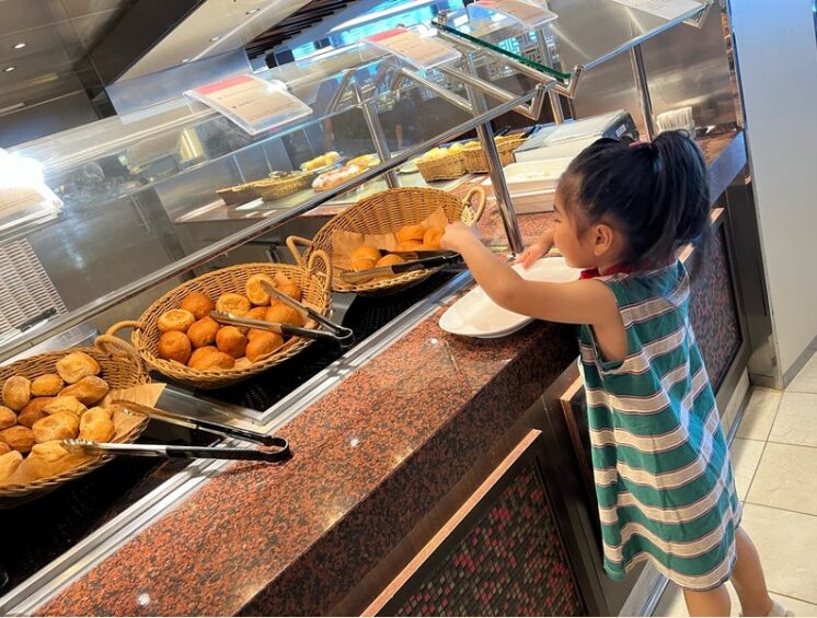 お腹が空けば24時まで営業しているビュッフェのマーケットプレイスで、うどんなど子供に食べさせたりもできます。