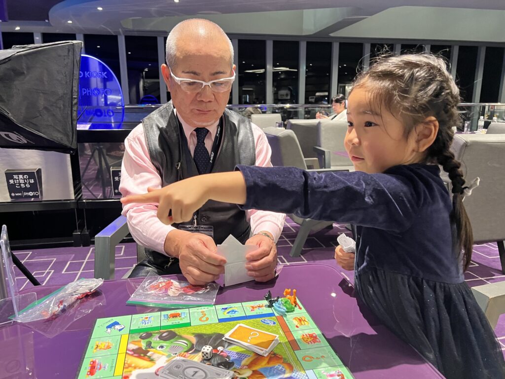 今回は飲み放題プランにしているので、ドリンク片手に娘が大好きな「モノポリー」を家族で楽しみました。