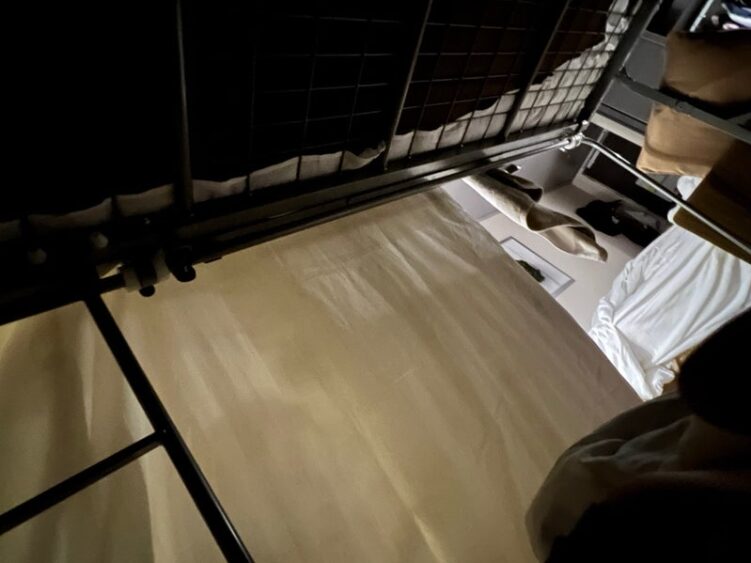 父が2段ベッドの上の掛け布団を床まで引っ掛けてくれて、下に光が入らないようにしてくれました。