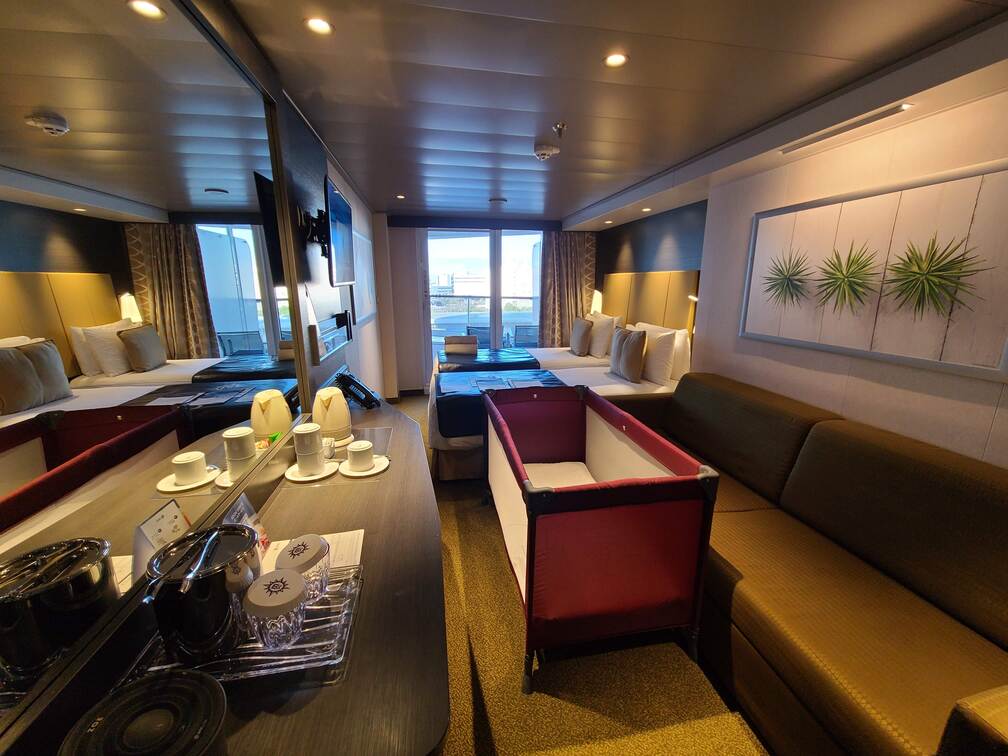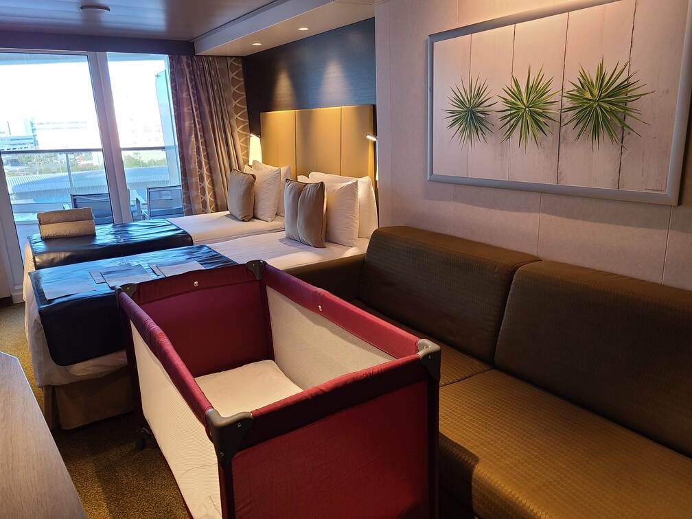 子連れでクルーズに乗船するならベッドを壁にくっつけられる内側客室や海側客室がおすすめですが、今回は娘のクルーズデビューということでちょっと贅沢に海側バルコニー付き客室にしました。