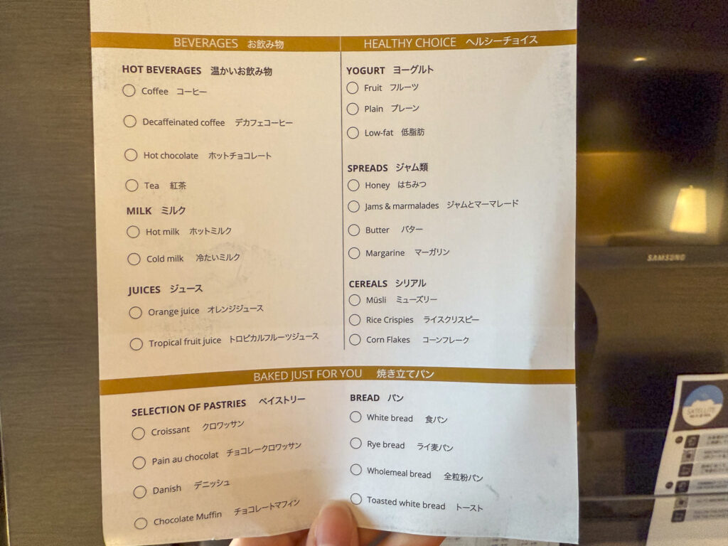 とはいえ注文できる品はパンとヨーグルトとシリアルと飲み物程度ですが、サクッとお部屋で朝ごはんを済ませたいという時に便利ですね。