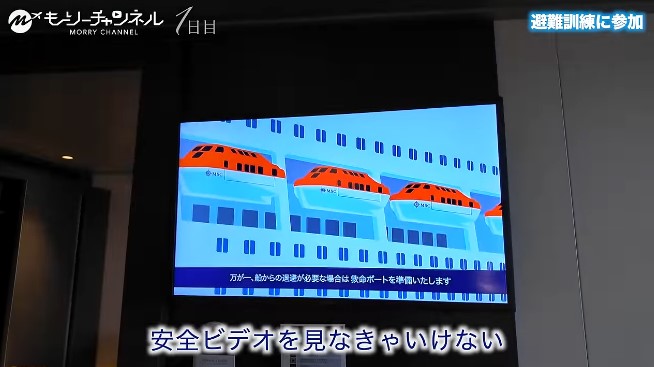 いよいよ乗船します。乗船後は全員が避難訓練に参加します。安全ビデオを観た後に、指定された場所に行きます。真剣な訓練ですがアトラクションのようで、わくわくします。