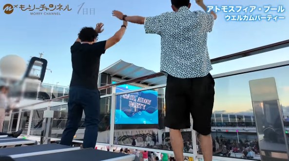 アトモスフィア・プールで盛大なウェルカムパーティーが始まりました!軽快な音楽が流れてみんなでダンス!