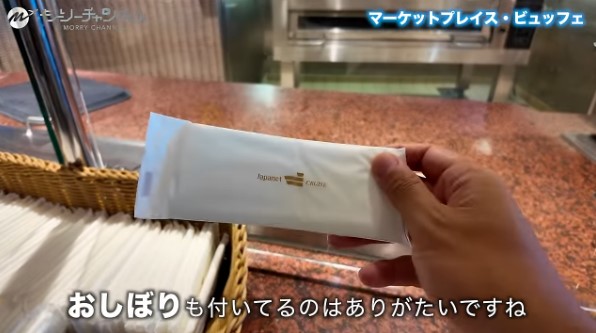 メニューは毎日変わるようです。全て食べ放題・飲み放題です。ジャパネットのクルーズには、おしぼりがちゃんとついてくるんですよ。
