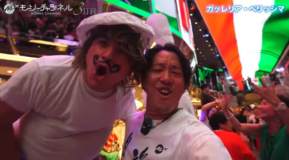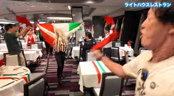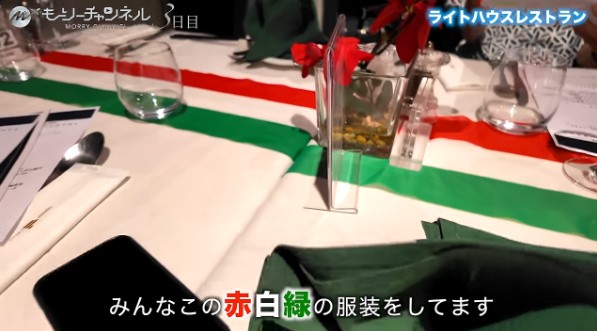 テーブルにはイタリアのカラーがあしらわれ、周りの人たちも赤・白・緑の服装で盛り上がっています。