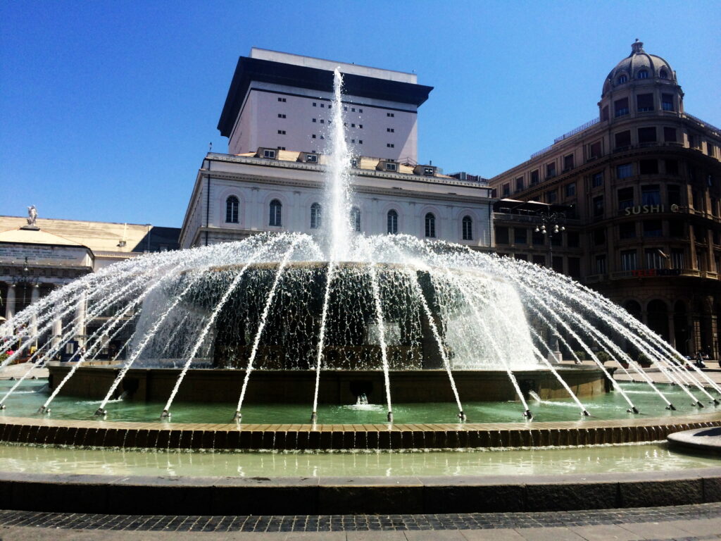 広場の中心には大きな噴水が設けられ、周囲にはカフェやブランド店が並びます。