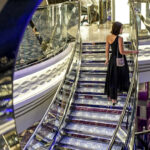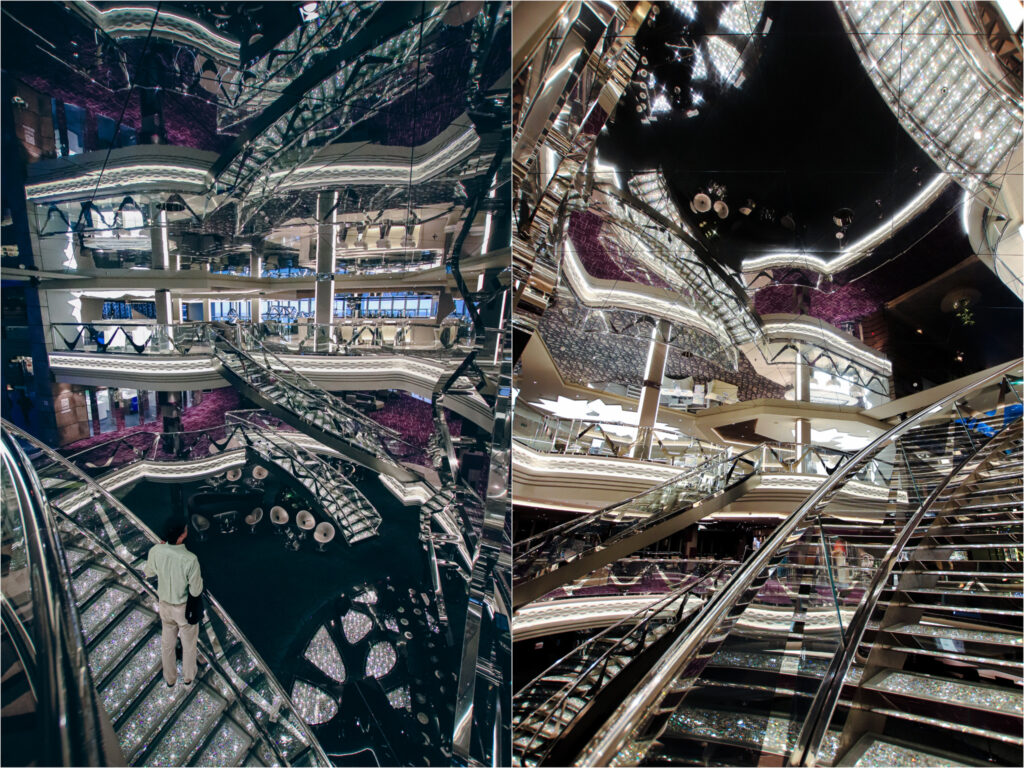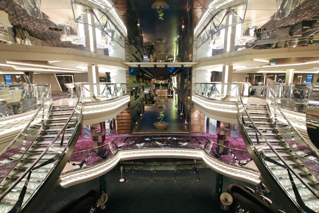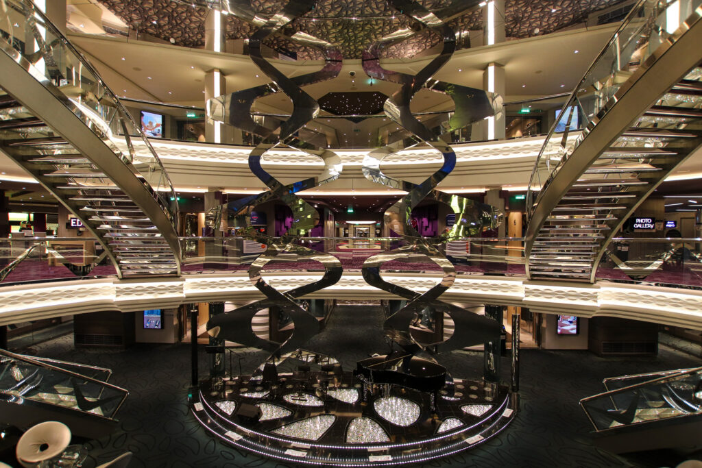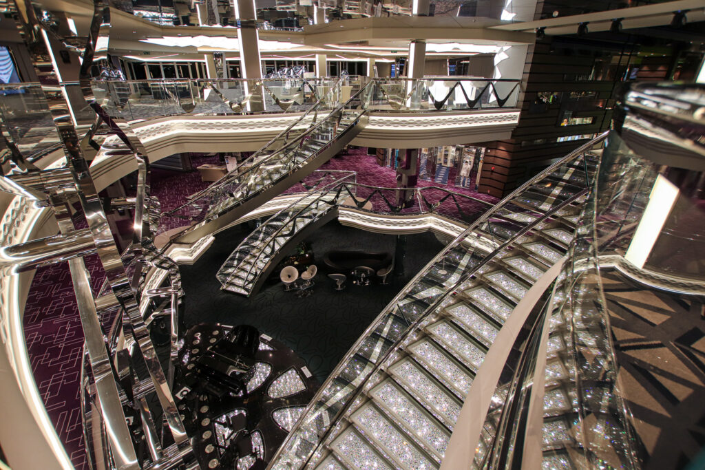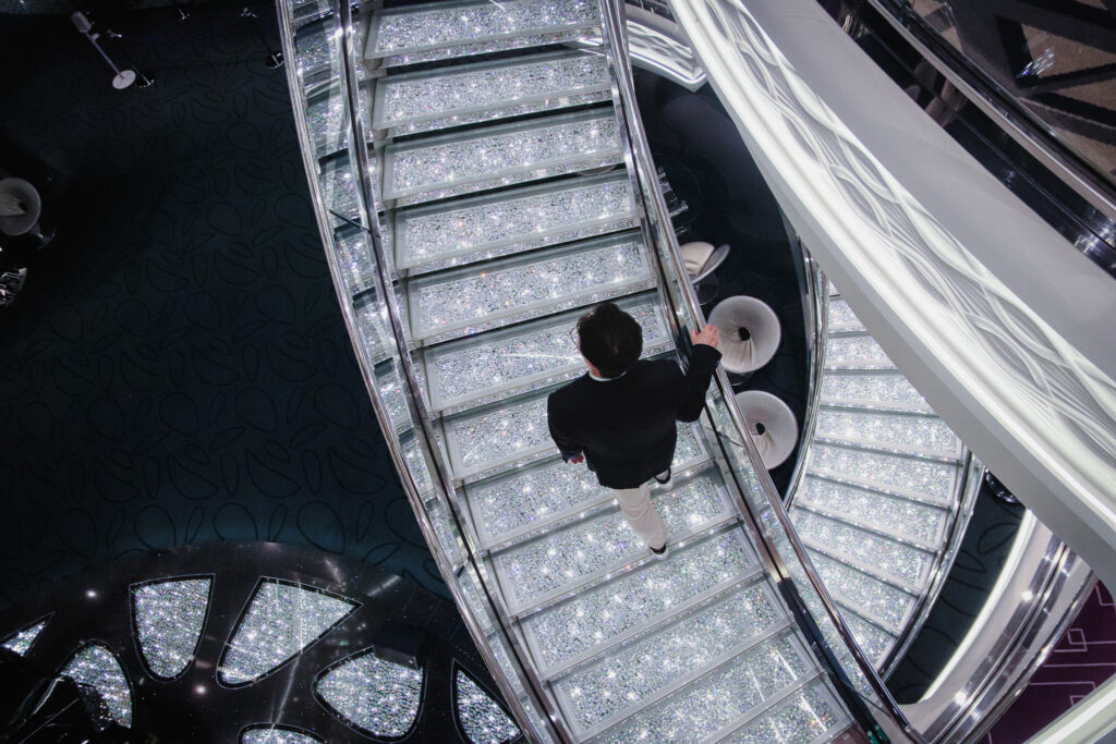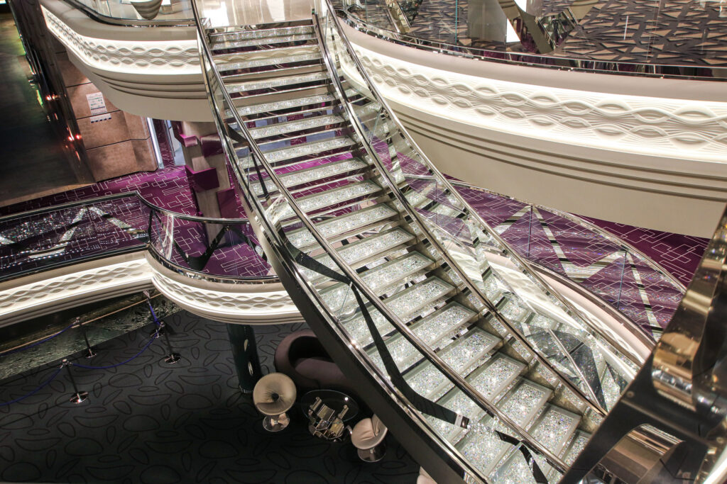 夜のパーティータイムではエレガントなドレスコードに身をまとい、このクリスタル階段で記念撮影をされる方も多いはず。1段につき640個、全体では約6万個以上のスワロフスキーの階段は、他の会社のクルーズ船でも見かけない特徴の一つです。