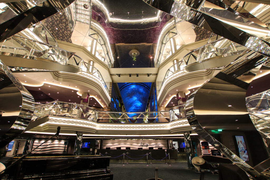 MSCベリッシマは、規模やサービスにより3つにカテゴライズされた、一般的な客船クラスのなかでも”カジュアル船”に属しますが、この空間は豪華絢爛そのもの。キラキラとまばゆく輝き、何度乗船しても高揚感が増します。