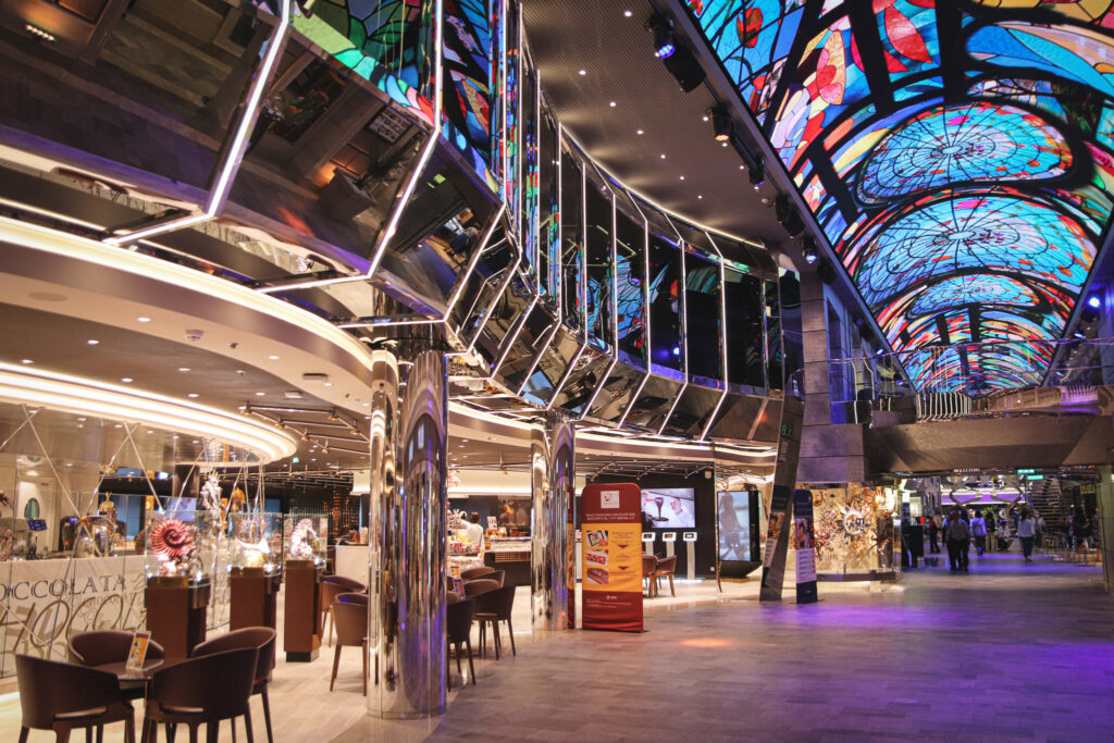 クリスタルがきらめく3層吹き抜けのプロムナード「インフィニティ アトリウム」は、MSCクルーズのアイコニック的な存在の一つ。