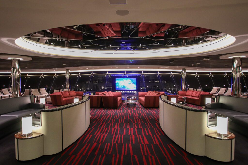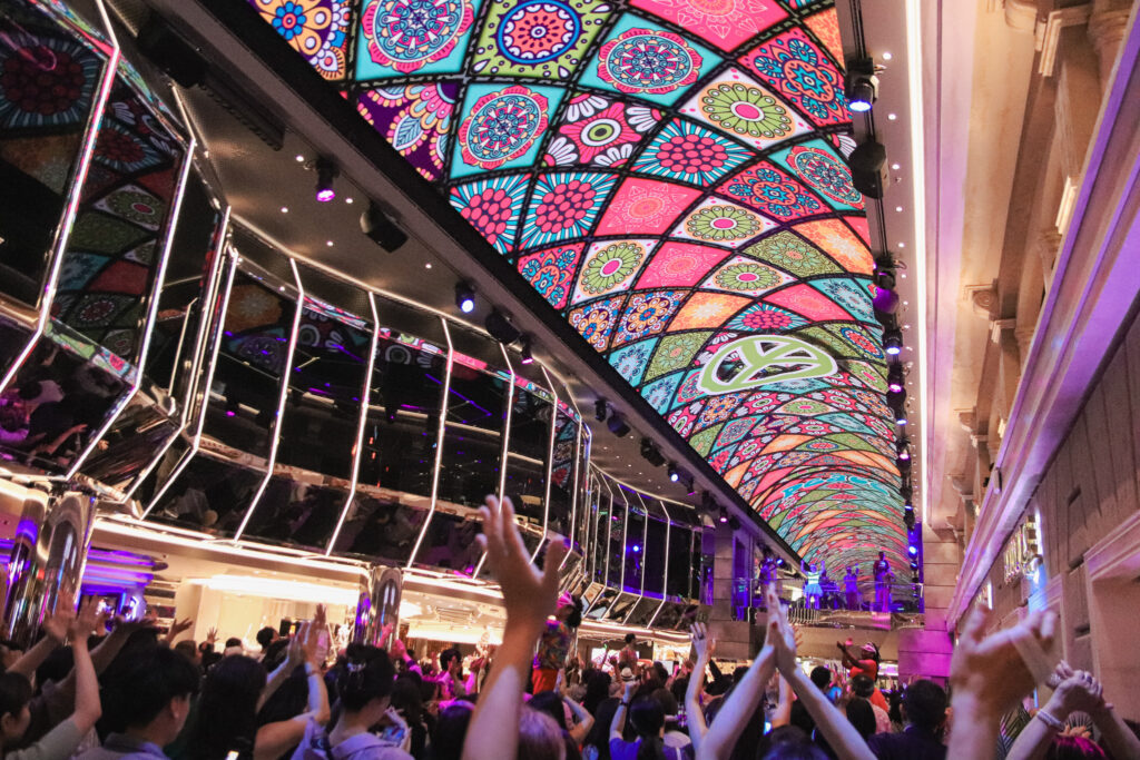 ドーム状の天井にある全長80メートルのLEDスクリーンスクリーンから様々な映像が流れ、テーマに沿った賑やかな音楽とともに、空間全体はゲストとクルーのグルービーな一体感で包まれます。