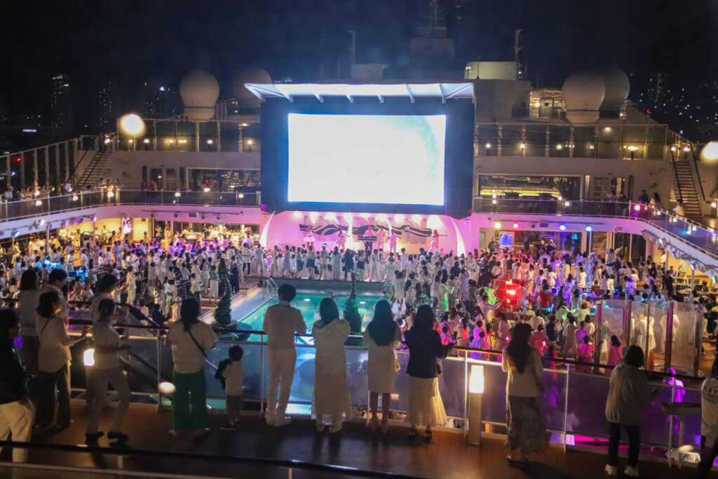 ホワイトナイトの夜は、プールデッキで開催中のホワイトパーティー全体を静かに眺められてナイス!