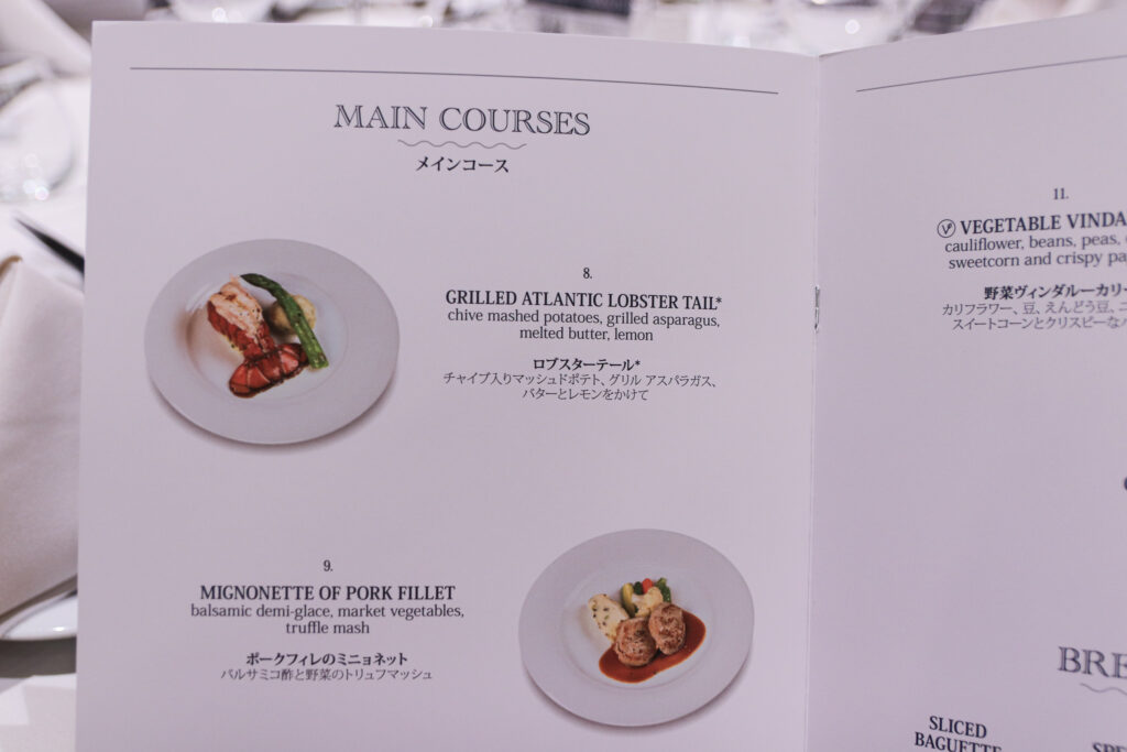 数年前のMSCベリッシマでは料理の写真付きメニュー自体も無かったように記憶しているのですが、今は英語と日本語のメニュー名と、素材や味付けまで日本語表記されていて、とても分かりやすい!