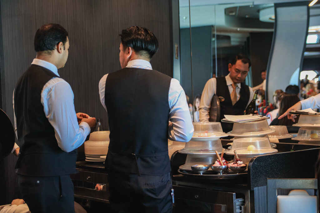 ちょっとした補足ですが、MSCベリッシマに限らず、大型客船の船上にある複数のレストランの厨房は、一つの大型ギャレー(厨房設備)に集約されており、そこから何千人ものゲストに料理が振る舞われるシステムになっています。出来るだけ早く、大勢のゲストにたくさんの料理を運べるような工夫にも気付かされます。