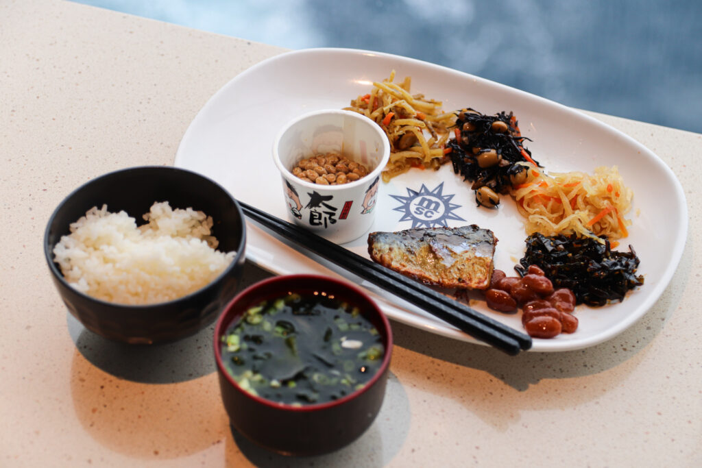 朝昼用、日本食を食べられるような工夫があり、特にデッキ15後方の「マーケットプレイス・ビュッフェ」では、メインの食事時間帯には、何かしらの日本食が用意されています。