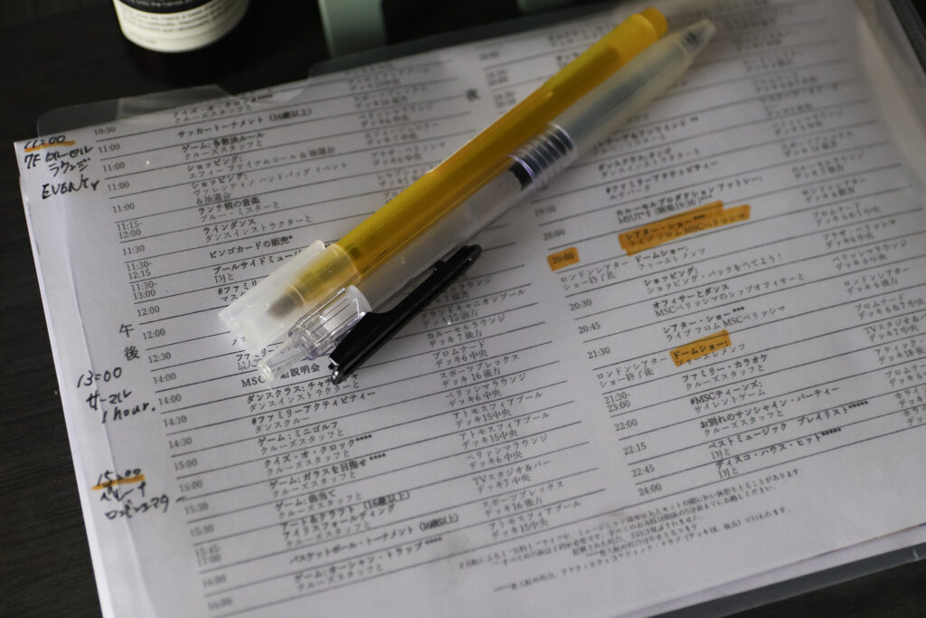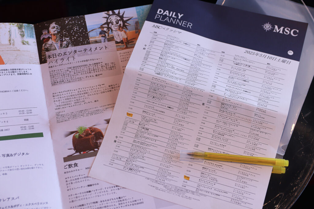 客室に配られるダイヤリープログラム(船内新聞)も、もちろん日本語です。船内の専用アプリ「MSC for Me」でも日本語表記でスケジュールチェックも出来ますが、私は配布された紙のスケジュールに、蛍光ペンと黒ペンを活用し、見逃せないイベントをチェックします。
