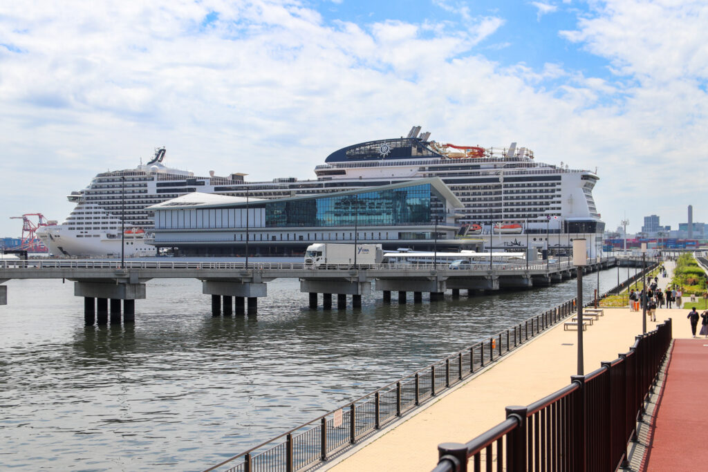 ▼東京国際クルーズターミナルより出港!手前のターミナルと奥の「MSC ベリッシマ」を比べても客船の大きさがよく分かる