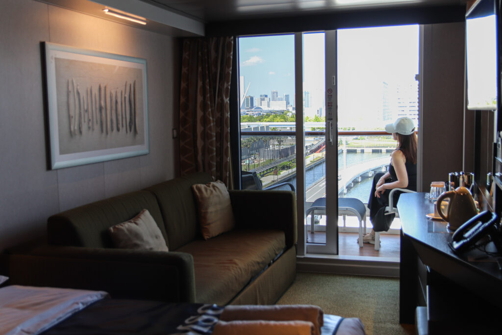 今回の海側バルコニー客室では、デスクやソファーがバルコニー側にありましたが、数年前に乗船した際は入口側にあったと記憶しているので、同じタイプの客室でも部屋によっては配置やキャビンのサイズ、室内設備などが異なるかもしれません。