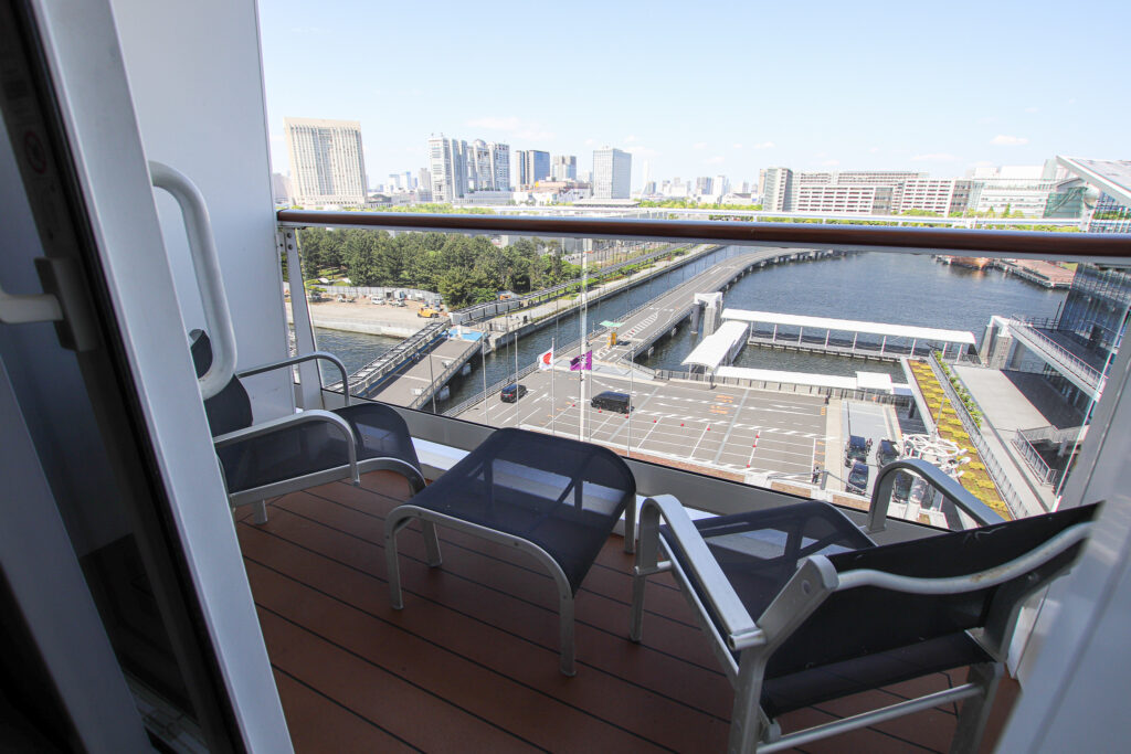 バルコニーには椅子が二つ、オットマン(フットスツール)兼テーブルのようなものが一つあり、私が過去に乗船したクルーズ客船と比べても、そこまでは広くはない印象。
