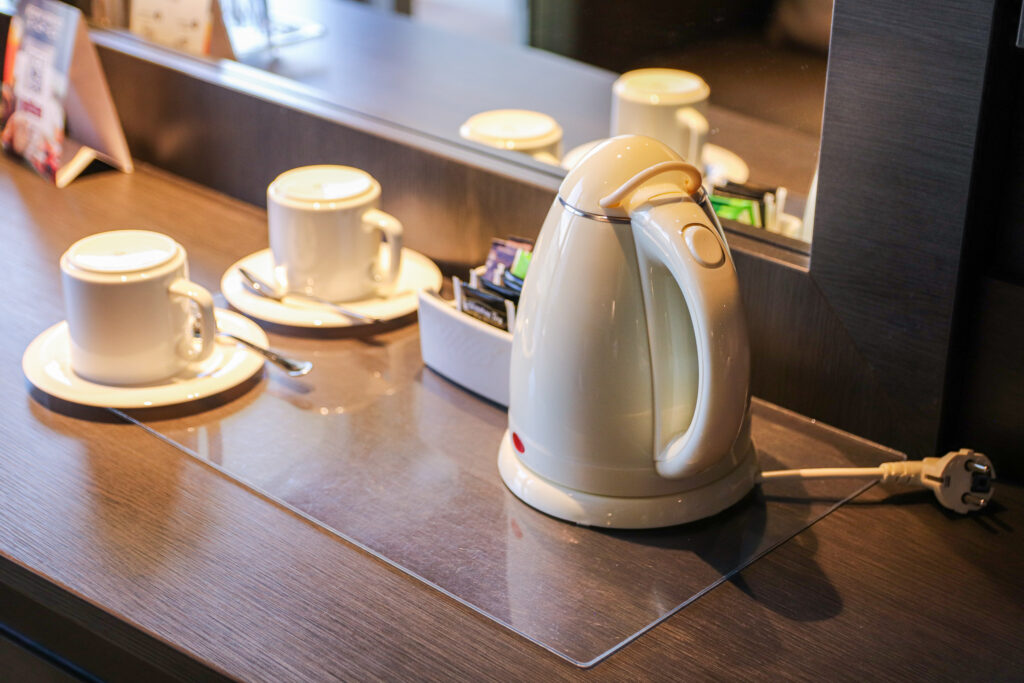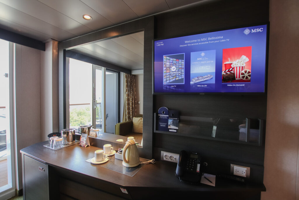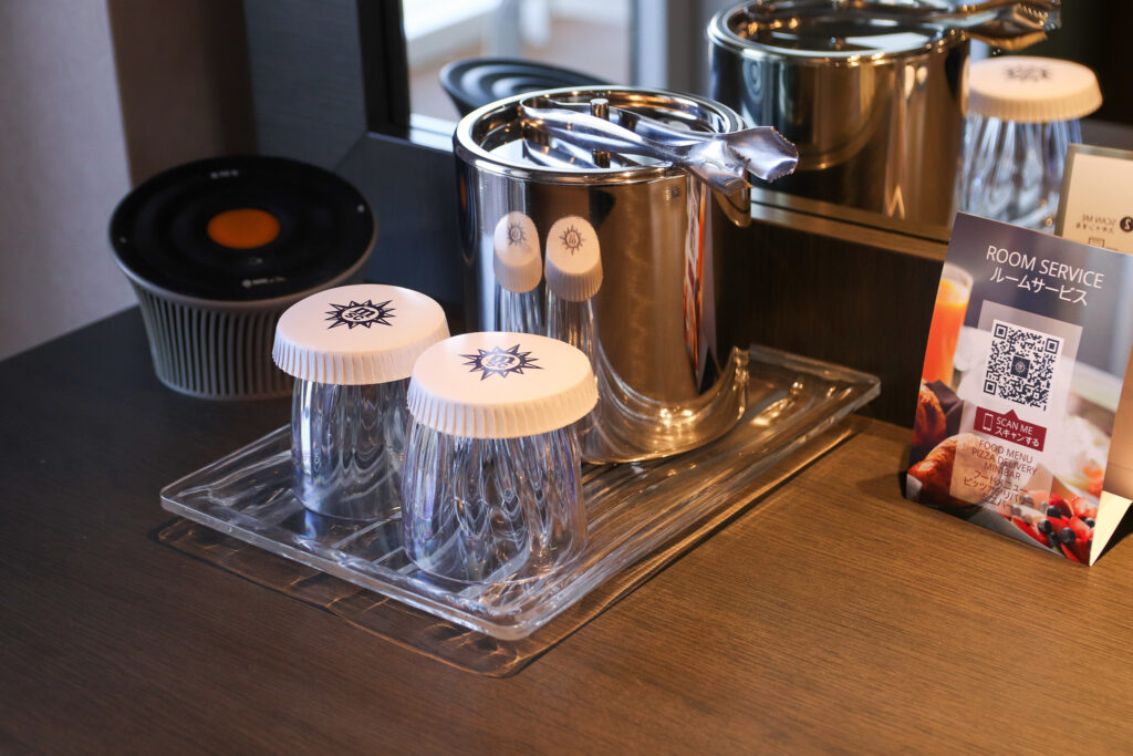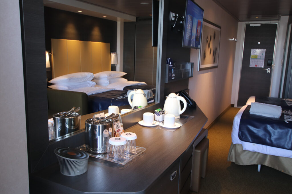 プラスチック製のグラス、アイスペール、陶磁器のカップ&ソーサー、ティーバックタイプの紅茶とグリーンティー、MSCクルーズロゴ入りのシュガー、電気ポットが用意されています。