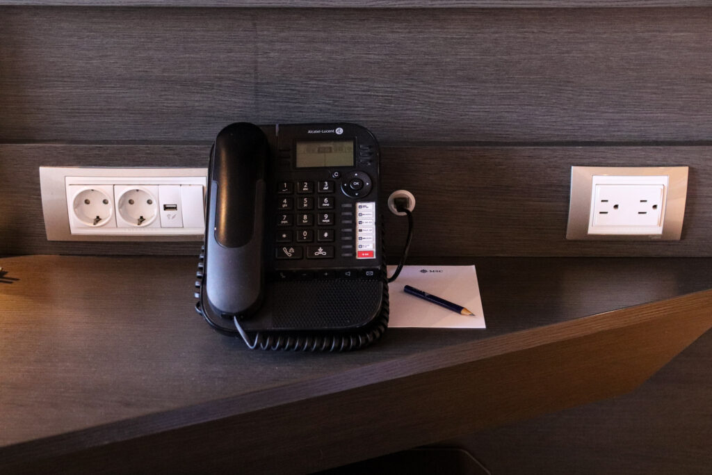 大きめのデスク右側には、日本のAタイプ電源(コンセント)×2、USBポート×1、そして海外のプラグC・SEタイプがあります。ヨーロッパなどのコンセント形状があるのは、さすが外国船ならではですね!
