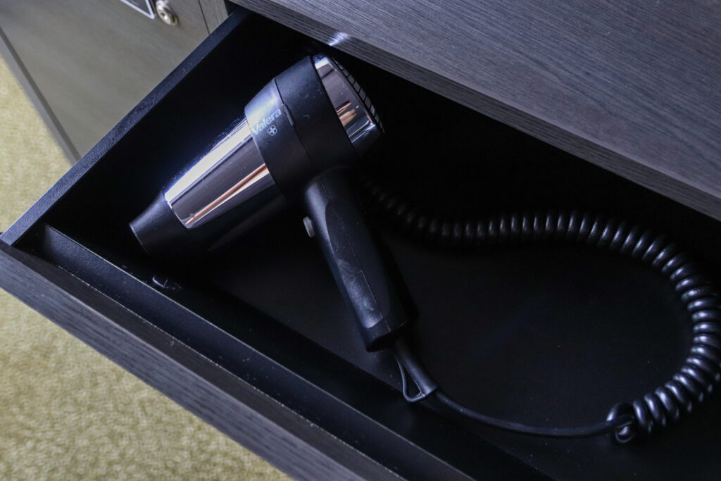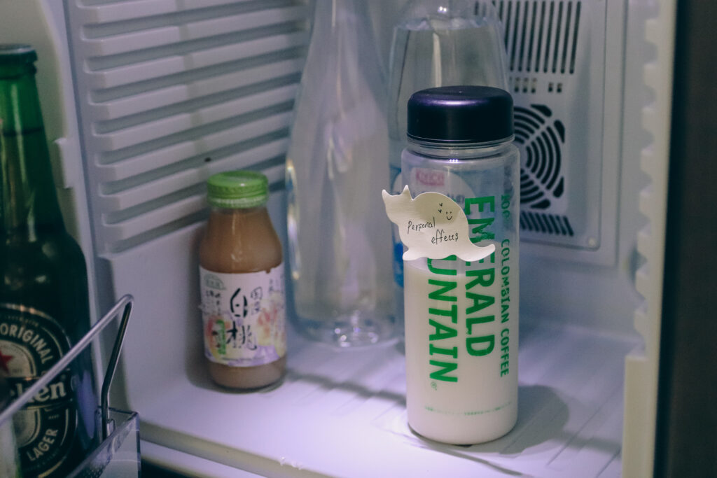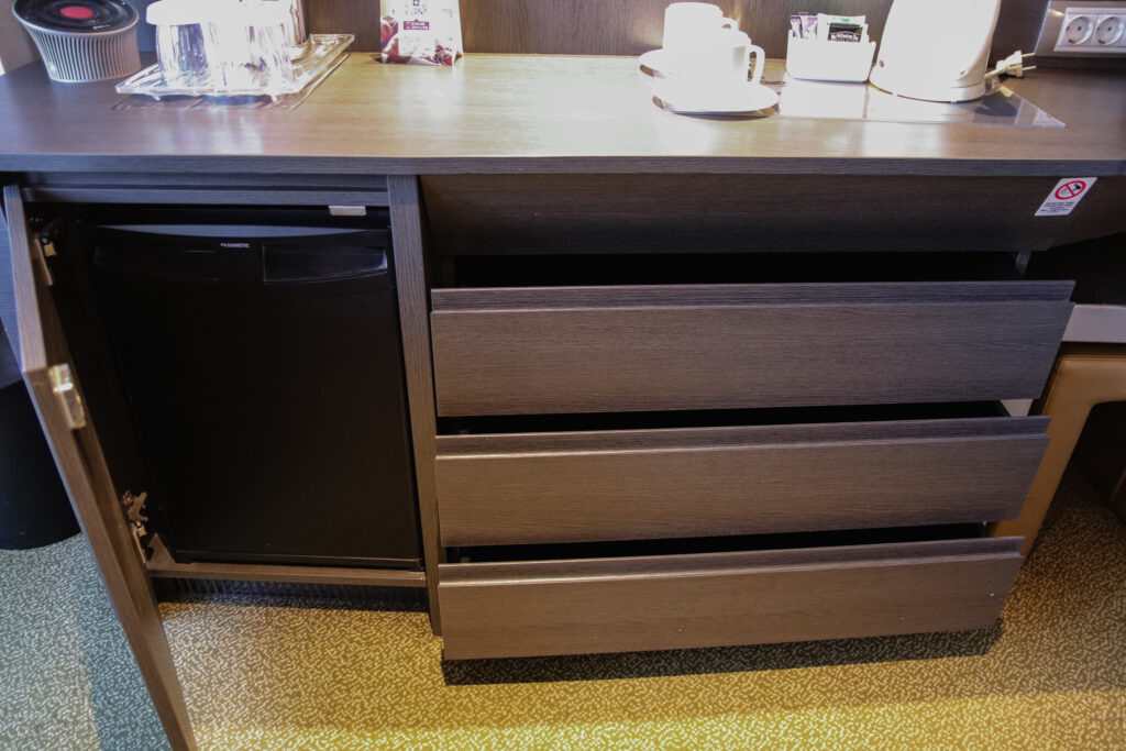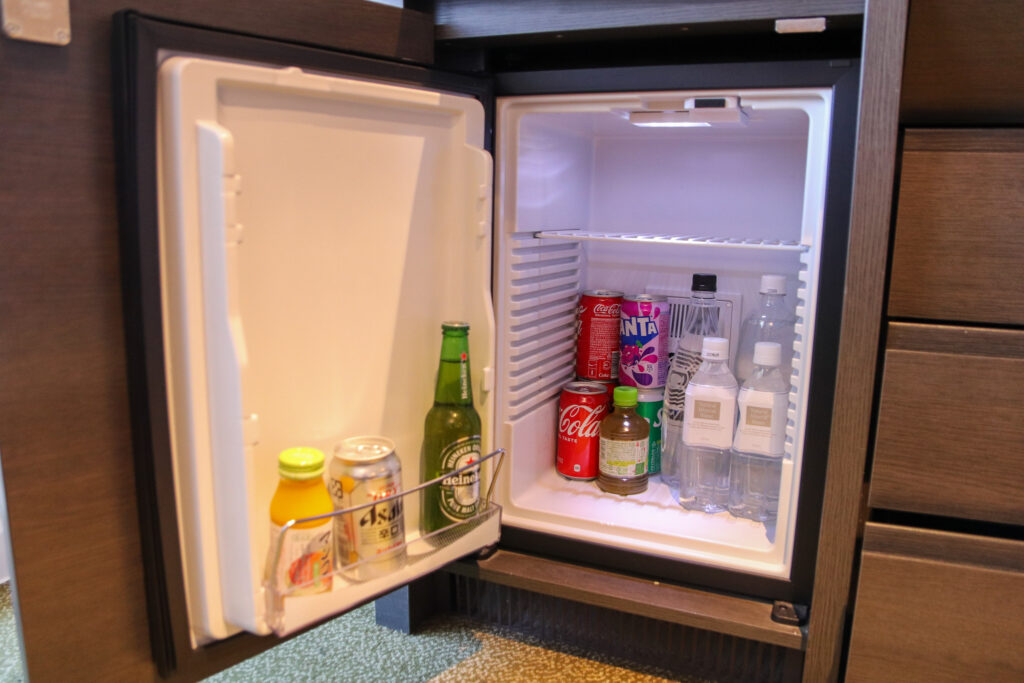 デスクの下には冷蔵庫、4段の引き出し(※一番上はドライヤーの保管場所)があり、冷蔵庫内にはミニバー(有料ドリンク類)があります。ドリンクパッケージを利用しているとインクルーシブ内で利用できるものもあるはずですが、感覚としては「無料のものではない」という認識でいる方がベター。ちなみにフロントに伝えれば、ミニバーの料金・価格表は届けてくれるのだとか。