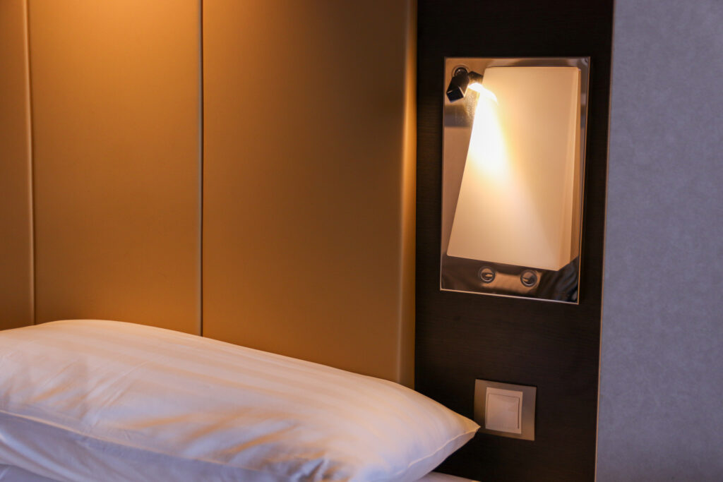 ベッドは要望に応じてツインに変更可能。写真では少し分かりづらいのですが、ベッドサイド横の電灯ボタンの右下に USBポートがあります。