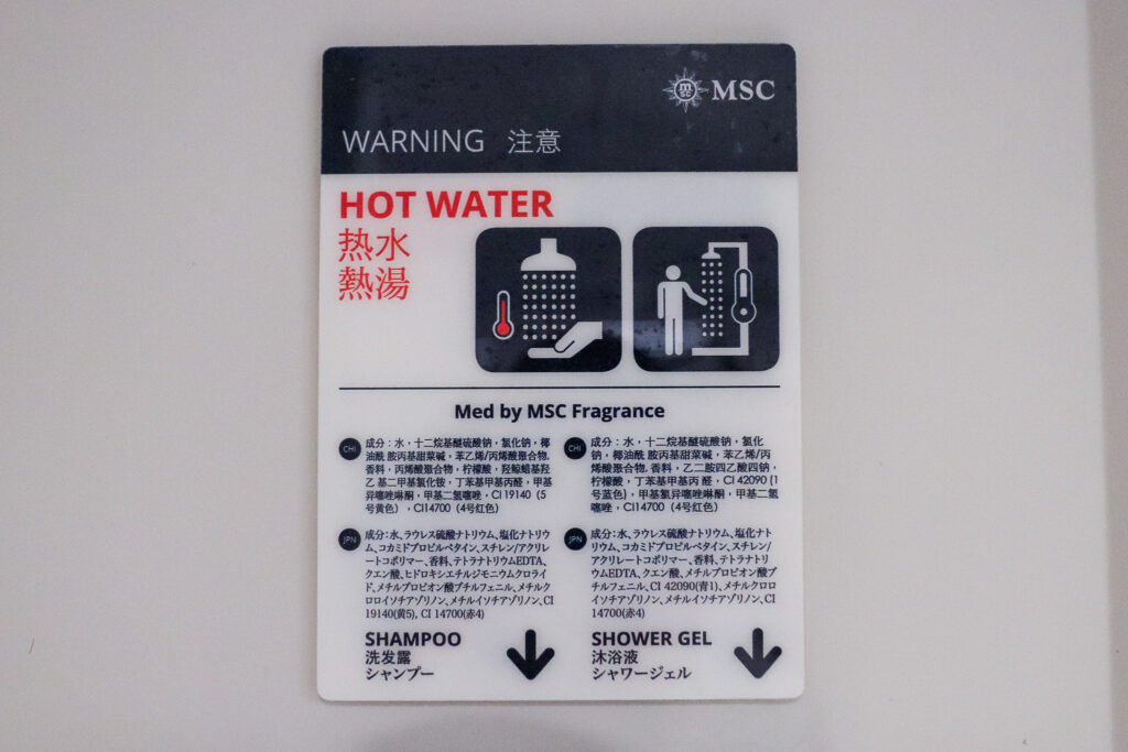 シャワー室内のシャンプーやシャワージェルは日本語の成分表の記載もあります。細かな点にはなるのですが、注意書きなどが日本語表記されていて分かりやすいですね。