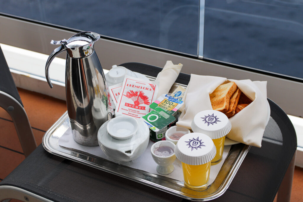MSCクルーズは、ニーズに合わせて理想の旅をカスタマイズできるエクスペリエンス「ベッラ」「ファンタスティカ」「アウレア」「ヨットクラブ」の料金体系が導入されています。私は「ファンタスティカ」エクスペリエンス だったので、客室での朝食ルームサービスが無料。下船最終日以外は、この朝食ルームサービスのお世話になりました。