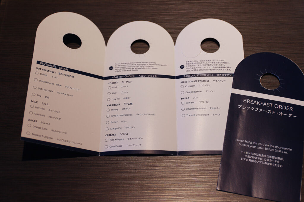 ブレックファースト・オーダーシートは日本語。食べたいものにチェックを記入し、前日の夜中2時迄に 入口ドアの外ノブにかけておけば OK! 一番早い時間帯指定は朝7時半~ですが、SNSでのうわさ通り、だいたい15 分ほど早く届きました。