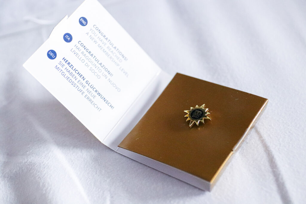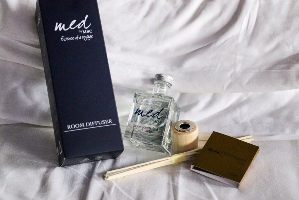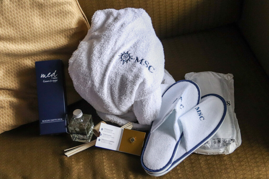 ▼Gold・ゴールドの特典(無料の貸し出しタオル地バスローブとスリッパ、オリジナルフレグランス「med」、会員ピンバッジ、MSC Voyagers Club のロゴ入り巾着)