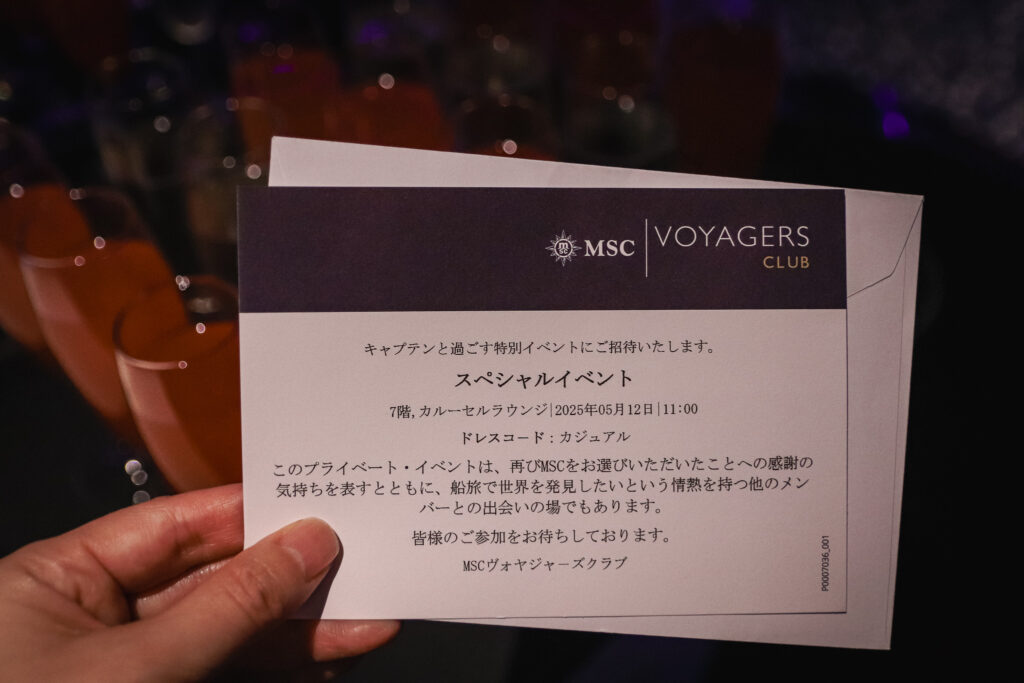 私が乗船した際は、開催日前日に招待状が届き、イベント自体は終日航海のタイミングで催されました。