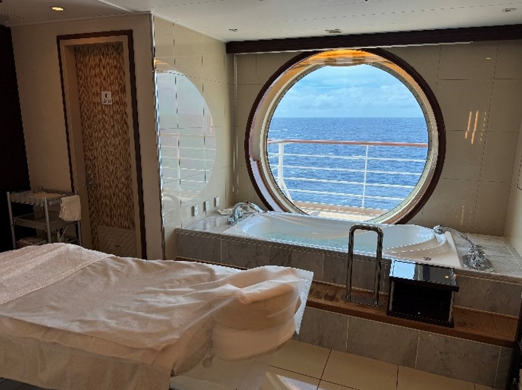 ネイル、美容室、スパまで一通り揃っているのが、にっぽん丸の魅力。海を望むジェットバス付きのスパは贅沢で、オーシャンビューを楽しみながらリフレッシュできます。船内限定のネイルデザインも愛らしくて、大人の女子旅にぴったり。