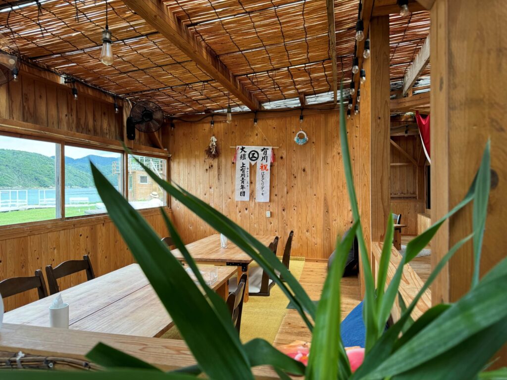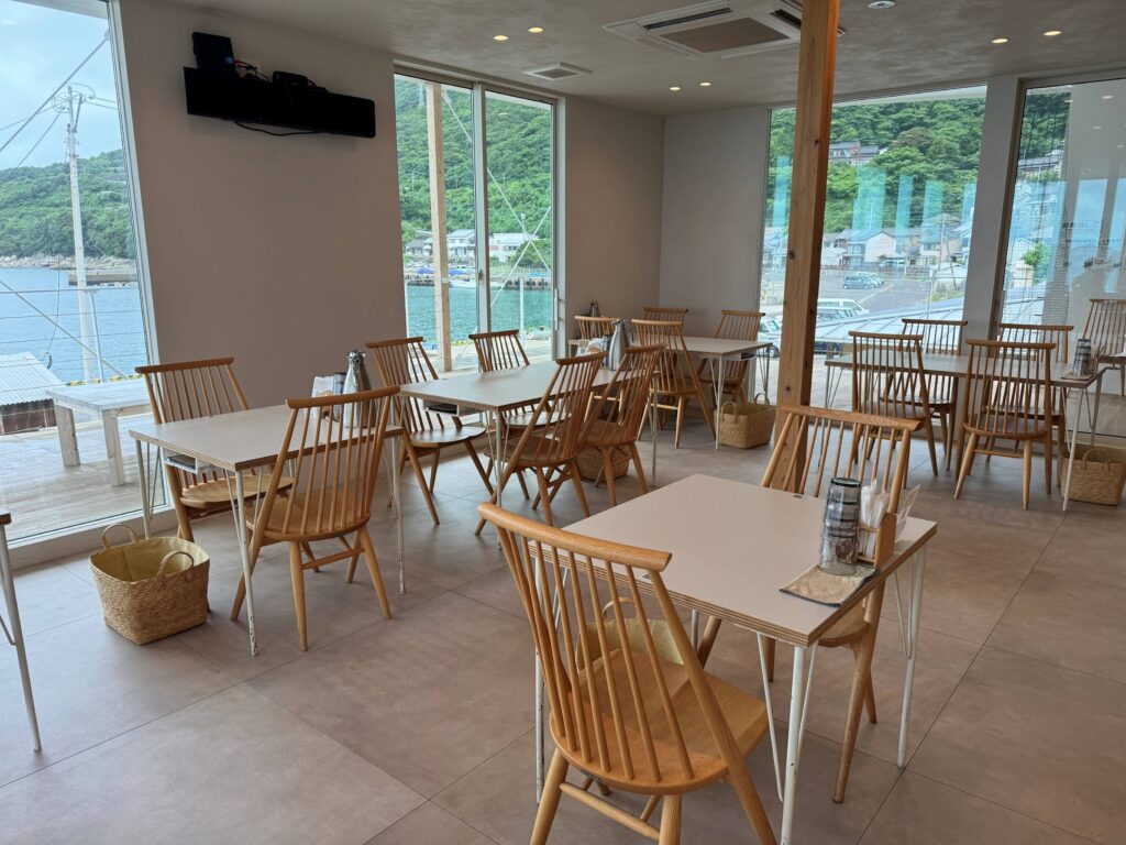 オーシャンビューのカフェでは、ぷりぷりのすり身が主役の「スリミバーガー」を楽しめます。デザートのかんころパルフェまで、海を眺めながらのんびりしたひと時が楽しめます。