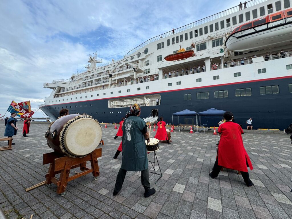 にっぽん丸が寄港中の港では、無料の五島うどんの振る舞いが。のど越しの良い、太めの“そうめん”のような食感が夏の体にすっと馴染みます。出港時は大漁旗と太鼓での見送り。船上からの「ありがとう」の声もあがり、旅人と地域の距離が一気に縮まる感動の瞬間でした。