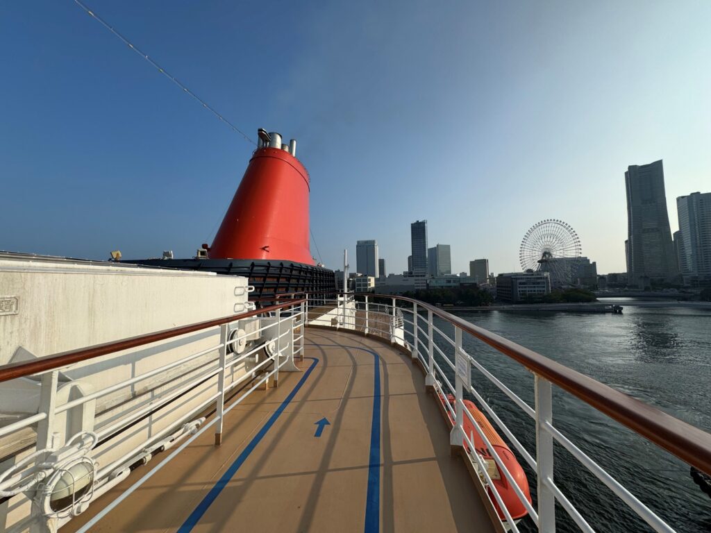 乗客は400名程のクルーズのため、ターミナルでの手続きはとてもスムーズ。甲板に出ると、旗が風を受けて小さくはためき、いよいよ出港パーティーへ。非日常の旅が始まる、この瞬間が大好きです。