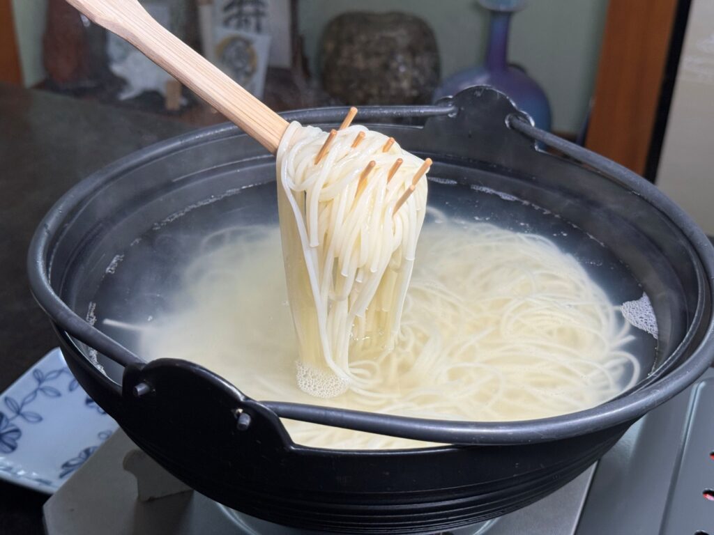 ランチは「割烹 扇寿」にて、五島うどんの地獄炊きと寿司のセットをいただきました。アツアツのお鍋から取り出す五島うどんは、なかなか伸びないのもポイントだそう。あご出汁の温かさにほっと一息。