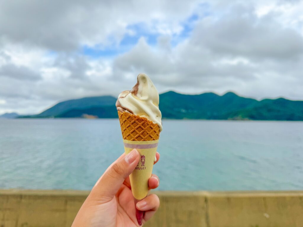 トトロ岩で知られる景観を楽しんだら、製塩所併設の売店で塩ソフトを。甘じょっぱいくせになるお味でした。