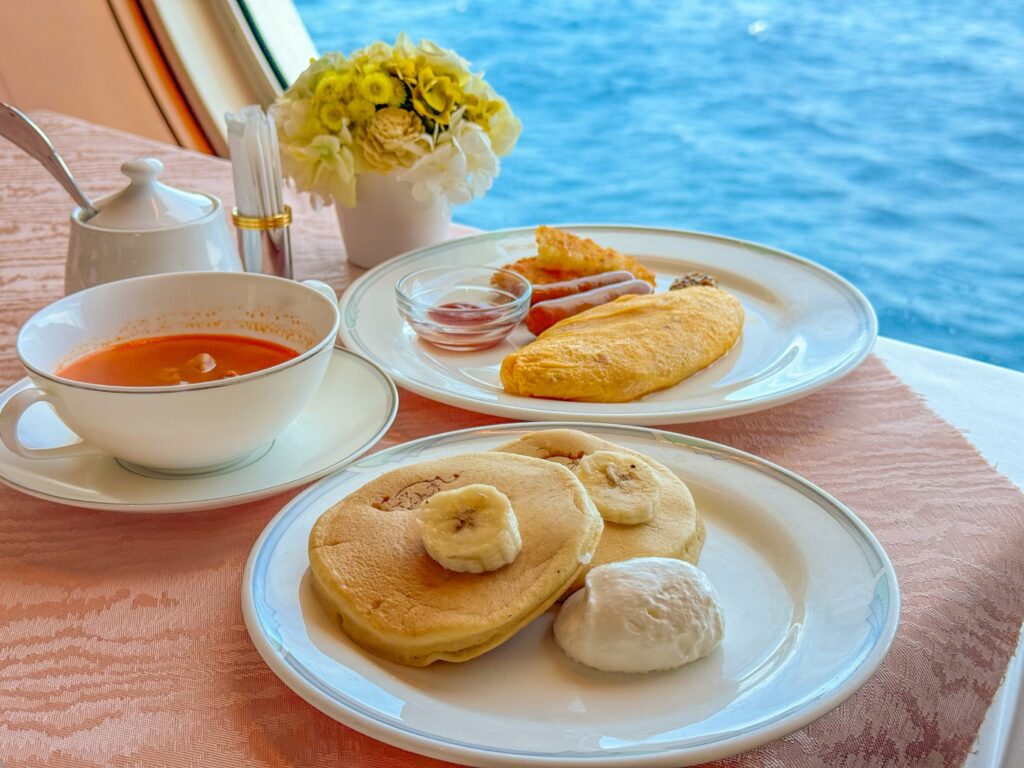 和食の安定感はもちろん、名物のにっぽん丸カレーや、ローストビーフも別格のおいしさ。天ぷらは衣が軽く、刺身は海の香りが立つ新鮮さで、まるで“洋上のレストランに連泊する”ような満足度で、親世代にも安心してすすめられるお食事でした。
