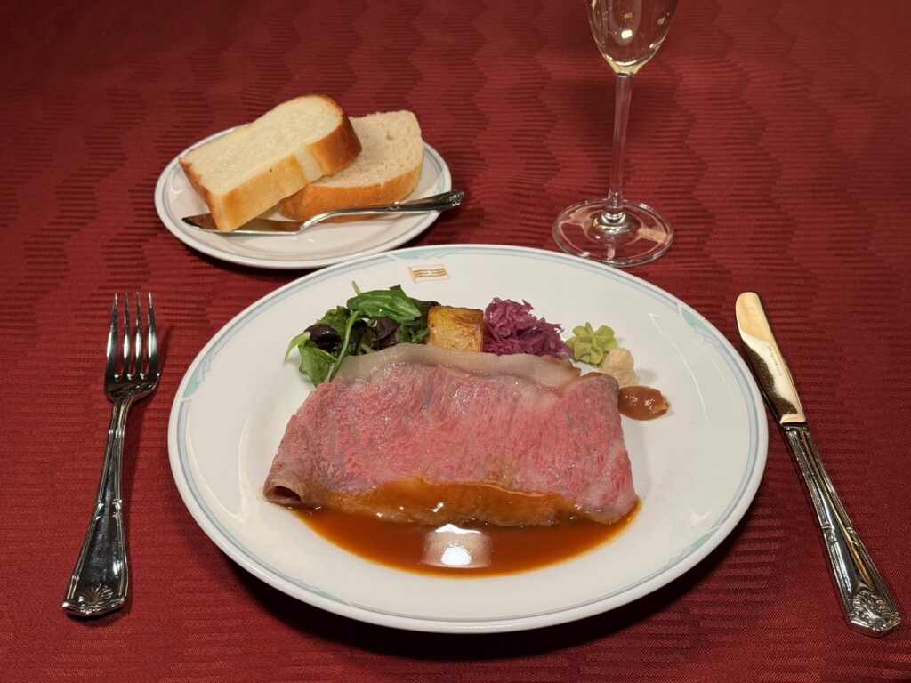 夕食はコース料理で和食や洋食を日替わりで楽しめます。名物のローストビーフは、口に入れた瞬間にとろける幸福感。リピーターが多い理由が一皿で伝わります。プリプリのオマール海老まで登場し、まるでディナークルーズでした。