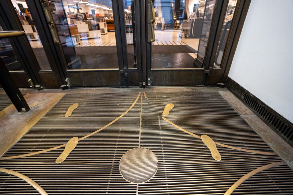 木製の入り口扉とローマ神殿のような列柱が並ぶ外観。コートや大きな荷物を預けて「本を楽しむ」空間になっています。