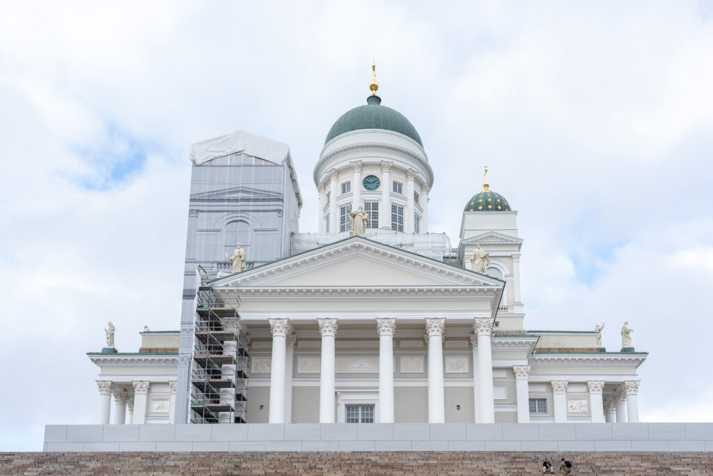 フィンランドを代表する白亜の教会。荘厳なドーム屋根が印象的。外装を修復中でしたが、12使徒の像も部分的に楽しむことができました。