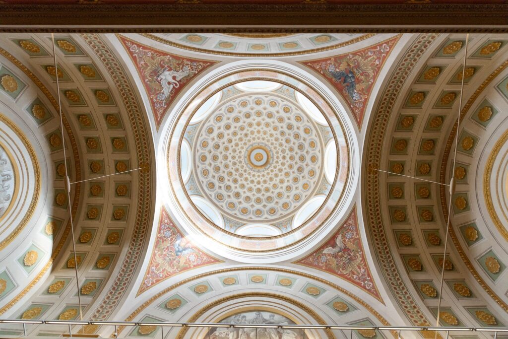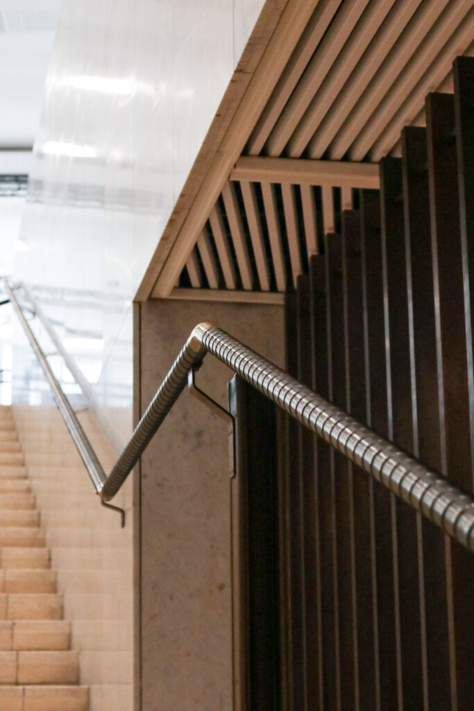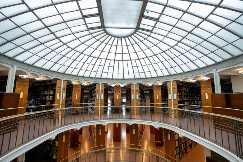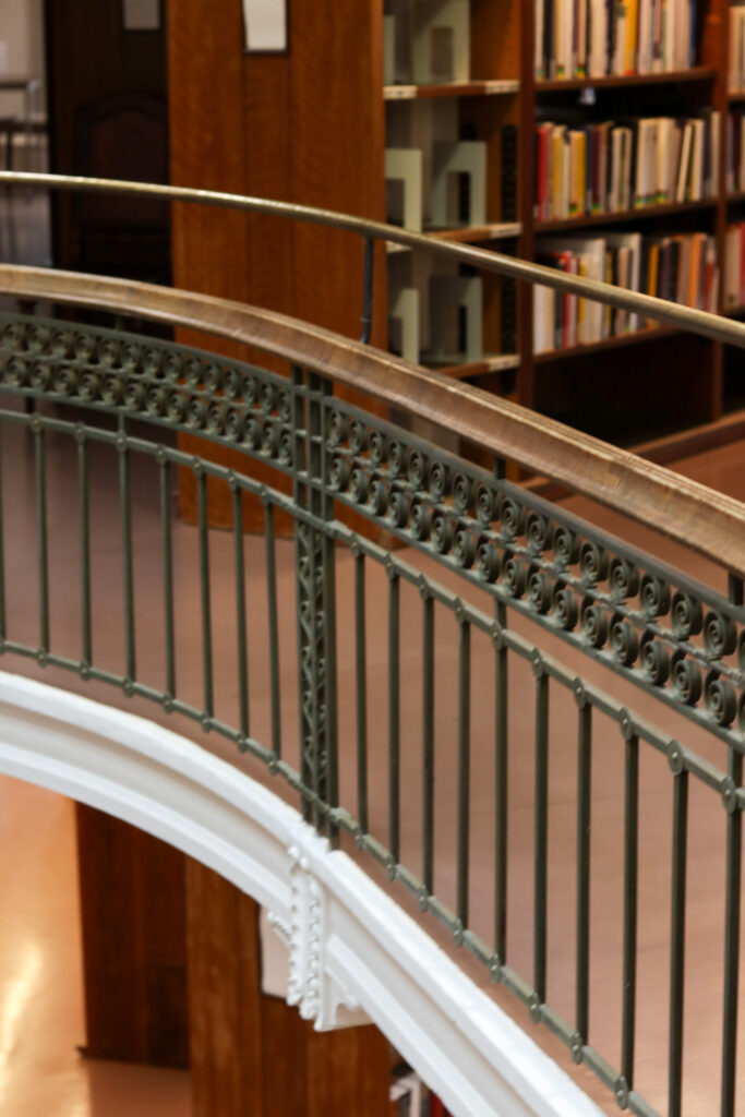 外から見ていると気づきにくいのですが、内部がドーム型になっています。植物をモチーフにした装飾が、柱や手すり部分に施されています。 アトリウムから注ぐ自然光と円形の吹き抜けが織りなす静謐な空間に身が引き締まります。
