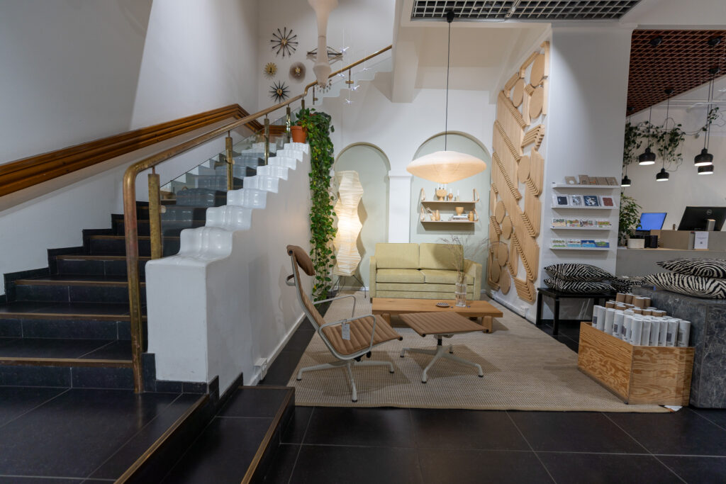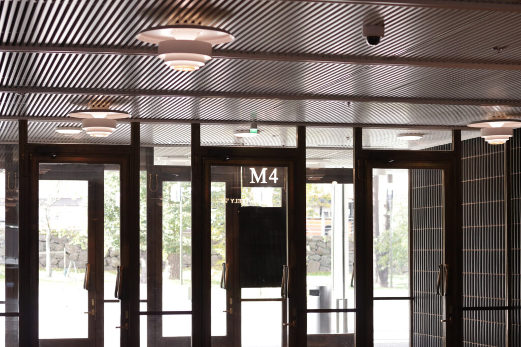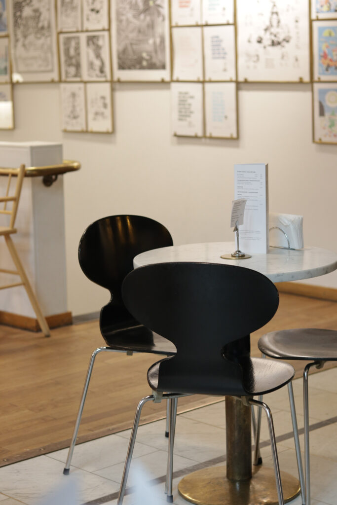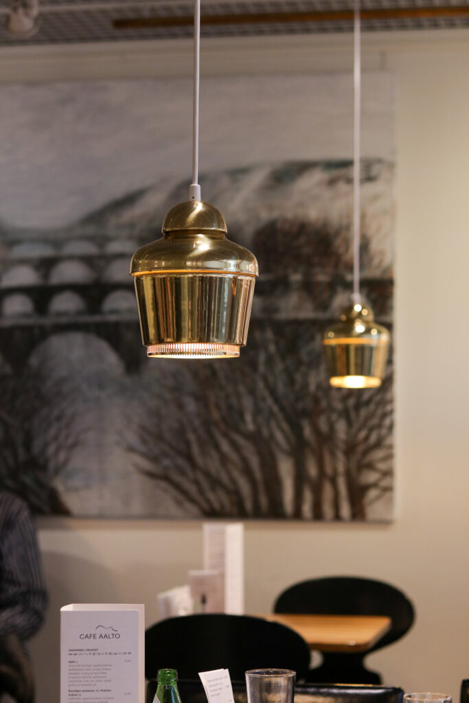 天井のクリスタル・スカイライト、入口のブロンズのハンドル、ゴールデンベルのペンダントライト。アアルトがデザインしたプロダクトが実際に空間で使われている様子を体験できます。 アルネ・ヤコブセンのアントチェアが使われているのも、家具好きさんはテンションが上がるポイントですよね。