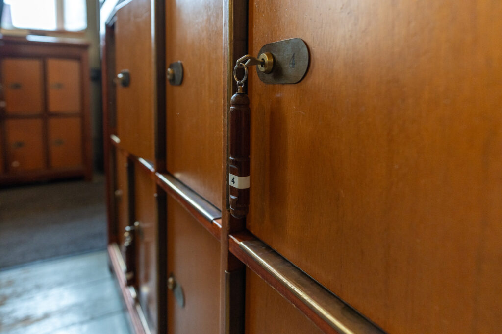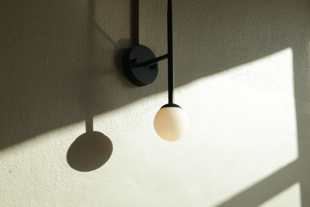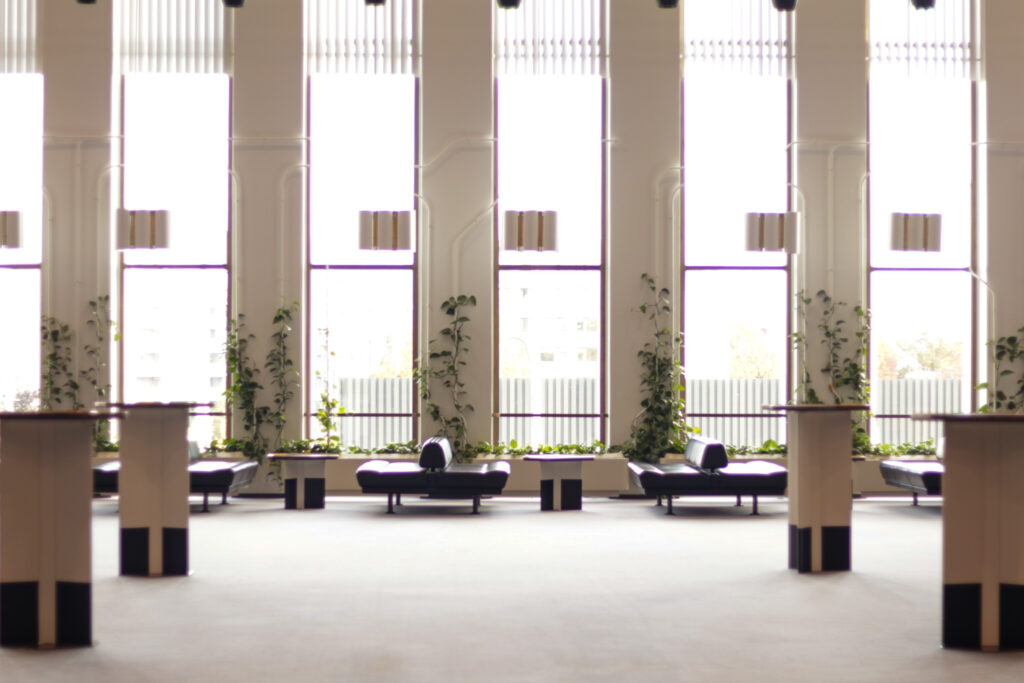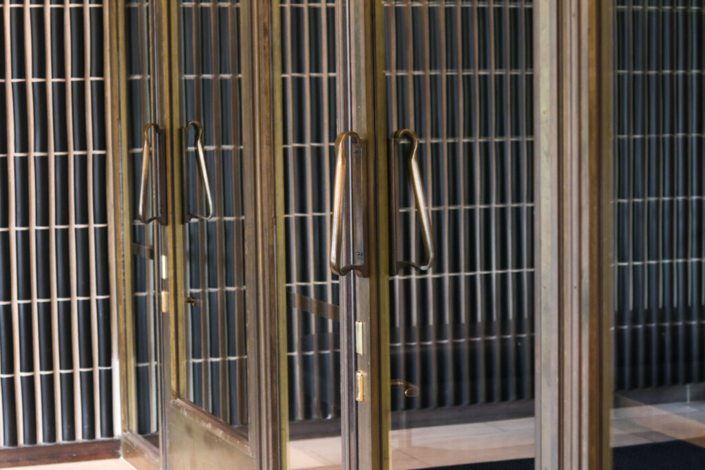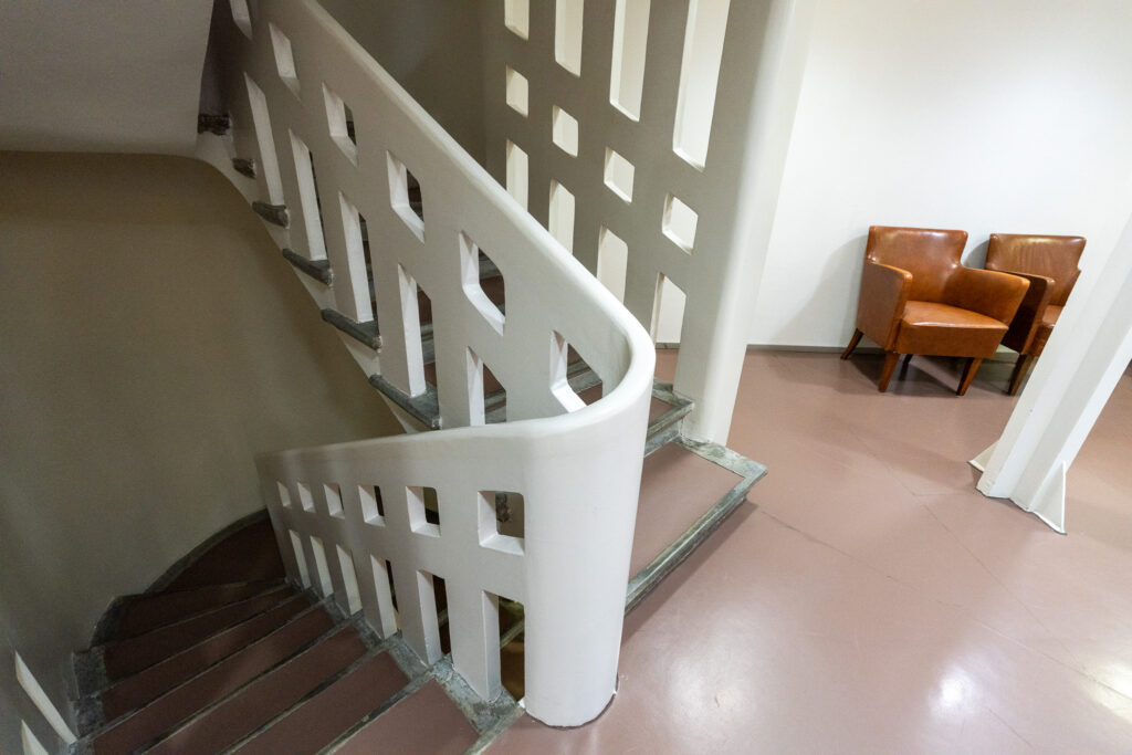 天井のクリスタル・スカイライト、入口のブロンズのハンドル、ゴールデンベルのペンダントライト。アアルトがデザインしたプロダクトが実際に空間で使われている様子を体験できます。 アルネ・ヤコブセンのアントチェアが使われているのも、家具好きさんはテンションが上がるポイントですよね。