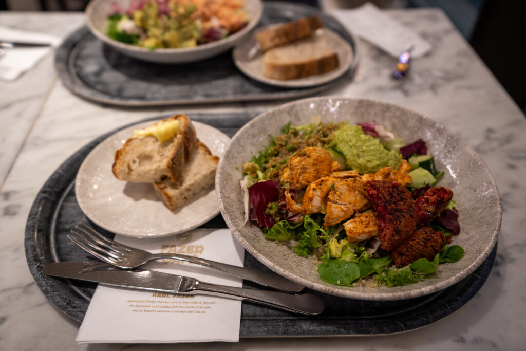 ヘルシンキ中央駅に戻りチョコレートで有名なFAZER直営カフェで夕飯。メインにプラスしてデリを選べるプレートメニューをオーダー。野菜がフレッシュで、北欧の食文化の豊かさを感じました。